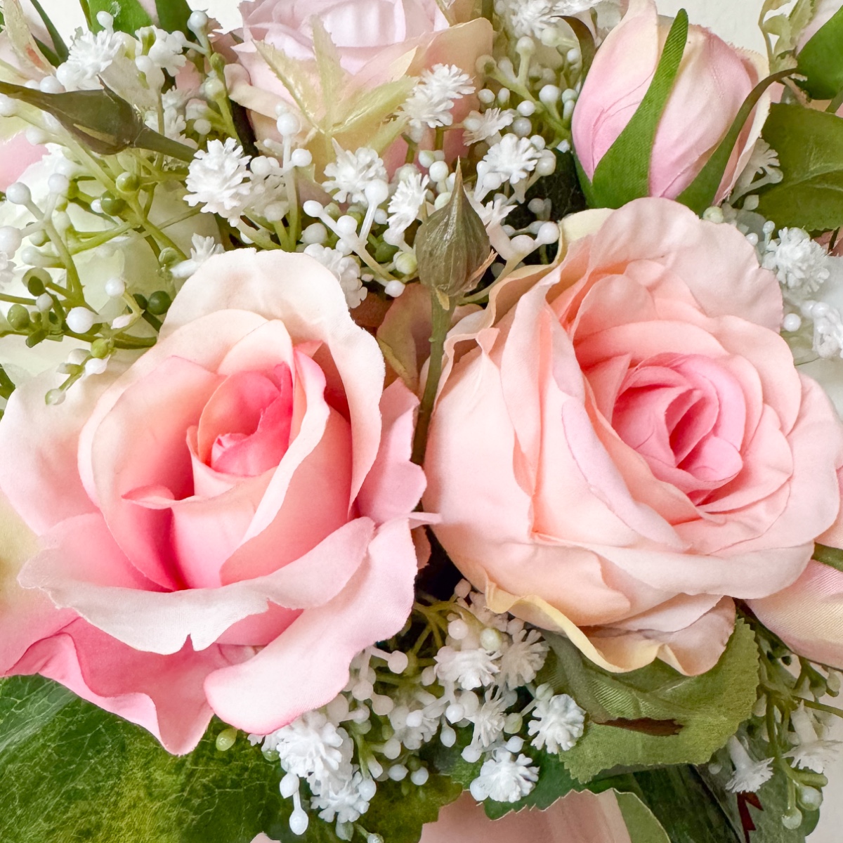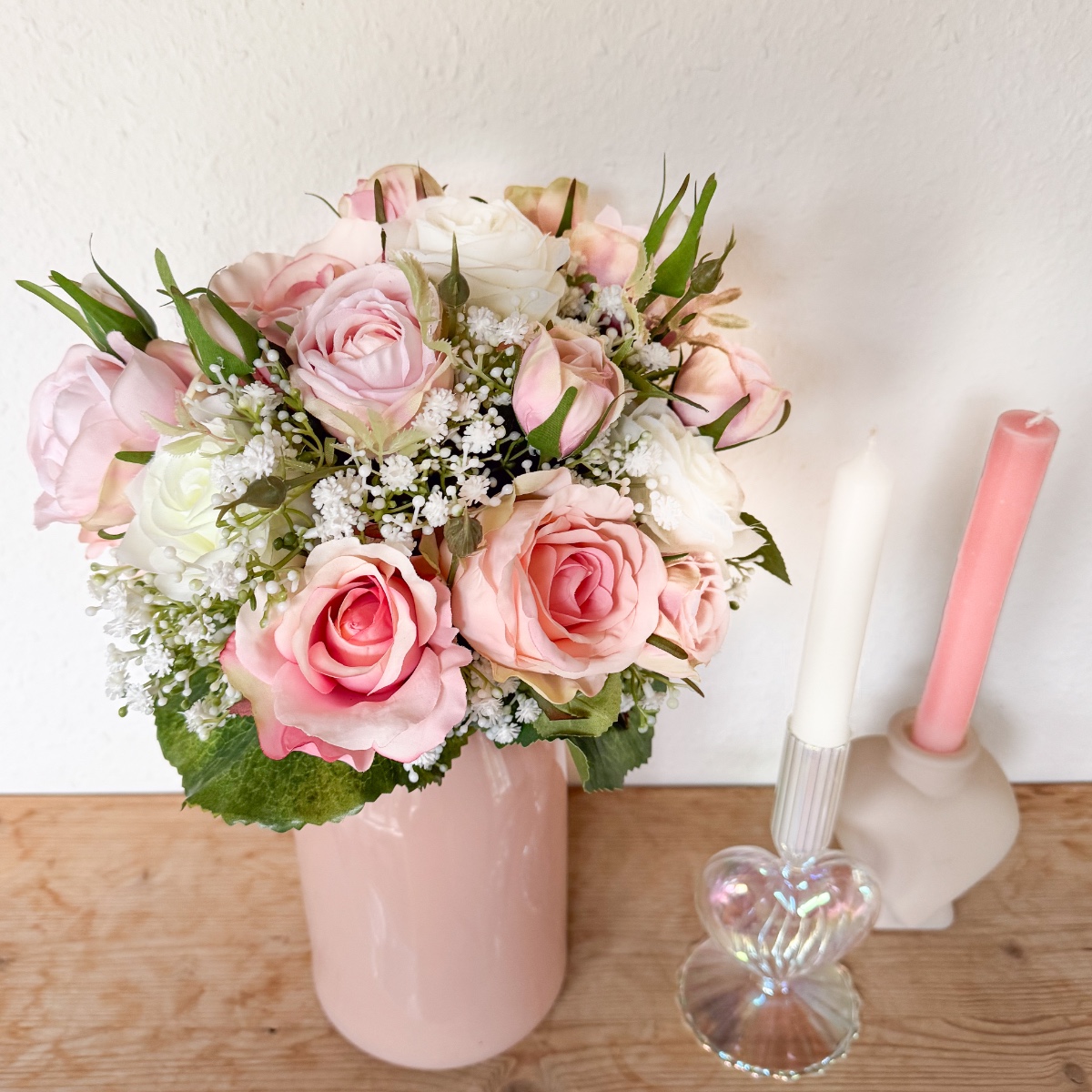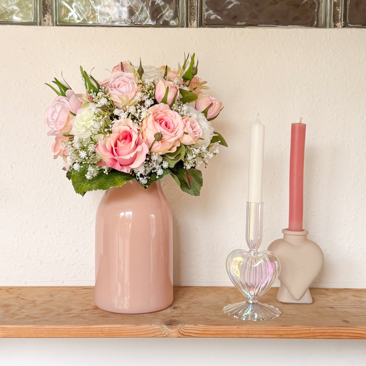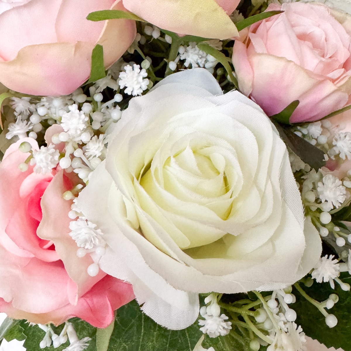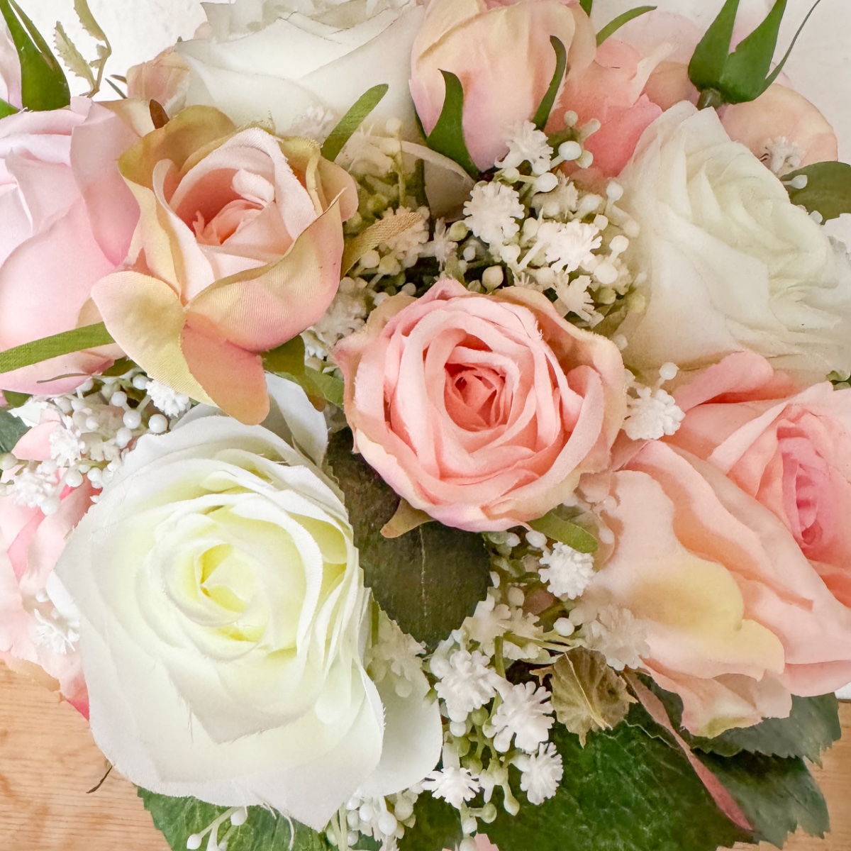 Bouquet da sposa eterno! Alcuni fiori raccontano storie, e questo bouquet ne racconta una davvero speciale. È stato realizzato sulla base del bouquet da sposa originale di una cliente, per conservare per sempre il ricordo del giorno del suo matrimonio. Delicate rose in diverse tonalità di rosa e bianco puro costituiscono il cuore di questa composizione. Tra le rose spicca il delicato velo bianco, che conferisce al bouquet leggerezza e naturalezza. Il tutto è incorniciato da un elegante bordo di foglie arrotondate di galax urceolata. Tutto è stato realizzato in modo tale che il bouquet sembri appena stato confezionato. Solo che questa volta non appassirà mai. Un ricordo che conserva la magia di un giorno speciale e tutti quei piccoli momenti che vorresti portare per sempre nel cuore. Acquista il look!