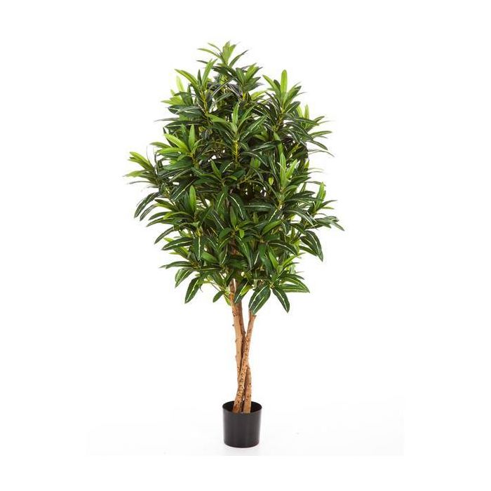 Albero di Croton Goldfinger (o Codiaeum variegatum) artificiale con ca. 1100 foglie disposte su 3 fusti naturali. Questo albero decorativo è inserito in un vaso ed ha un'altezza complessiva di ca. 105 cm.