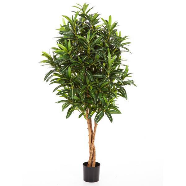Albero di Croton Goldfinger (o Codiaeum variegatum) artificiale con ca. 1150 foglie disposte su 3 fusti naturali. Questo albero decorativo è inserito in un vaso ed ha un'altezza complessiva di ca. 125 cm.