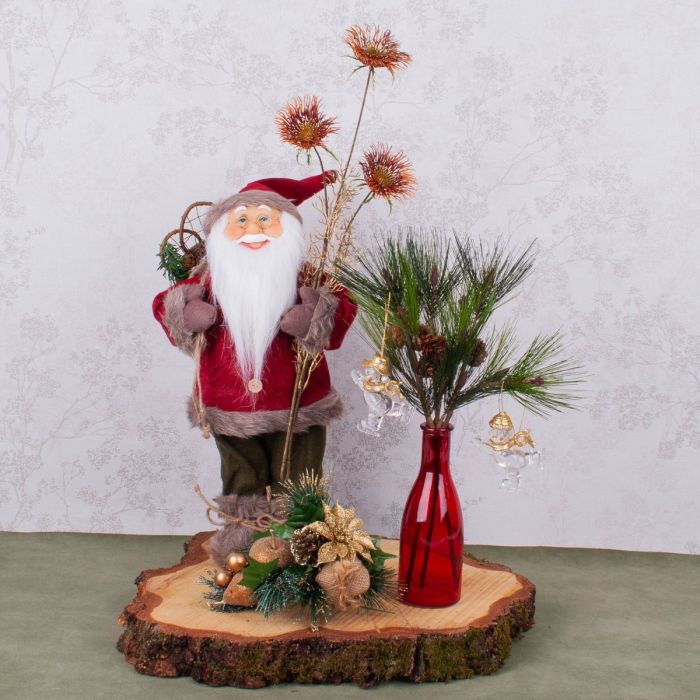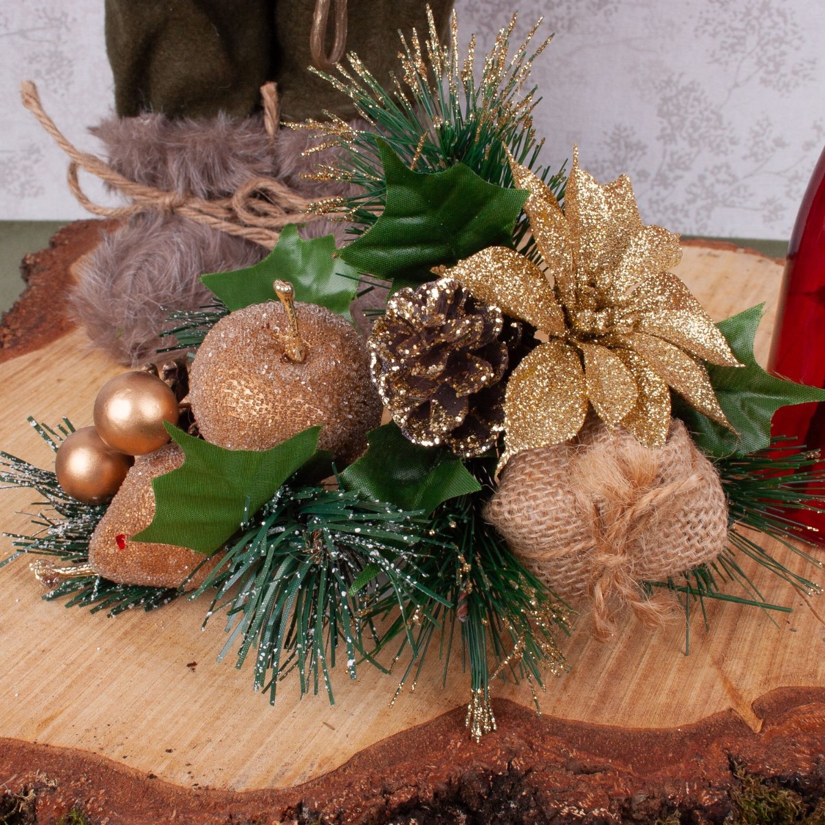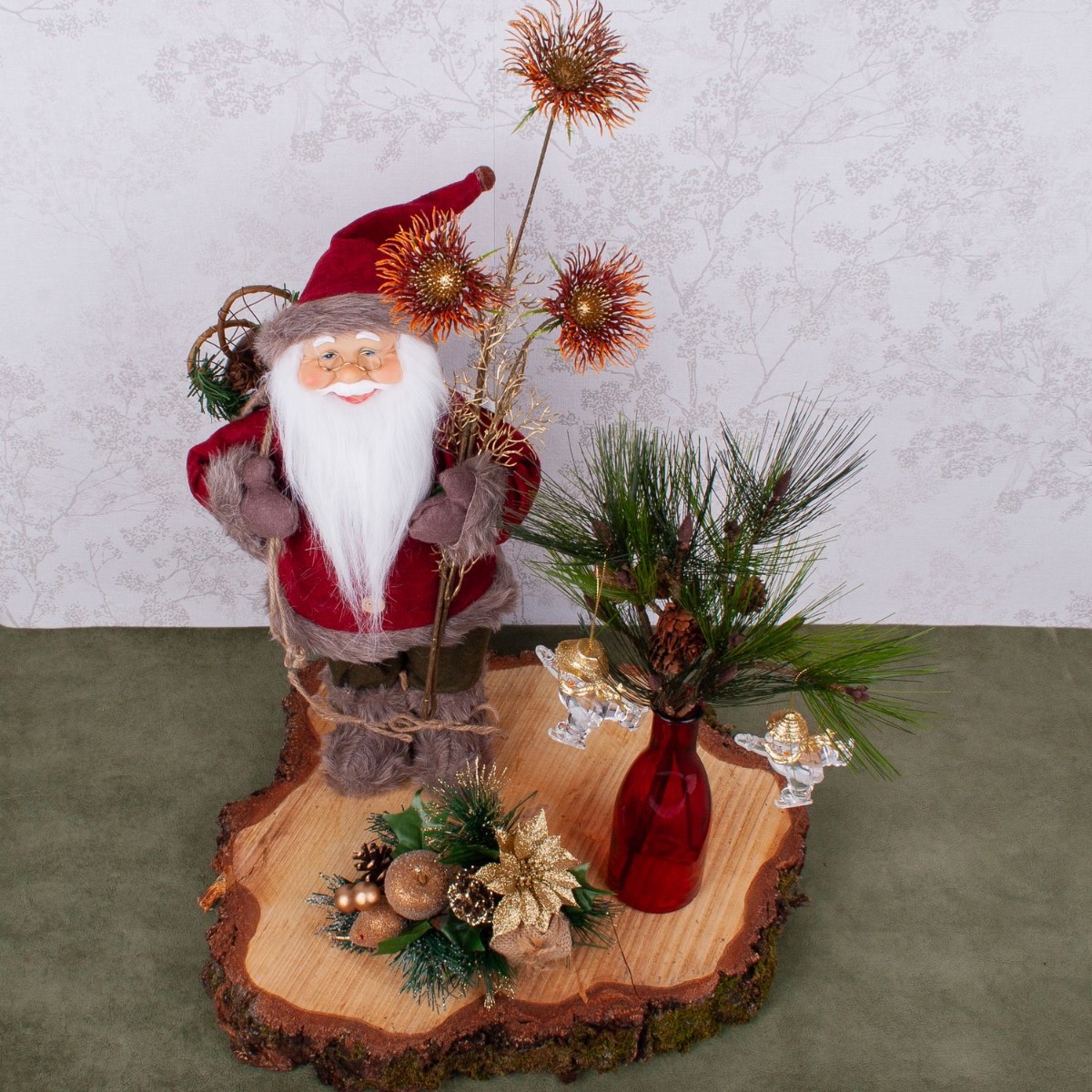 Consiglio per la decorazione: La zinnia rossa viene messa nella mano di Babbo Natale. Posizionare il ramo di pino nel vaso e attaccarvi gli ornamenti dell'albero di Natale. Disporre tutto sul disco dell'albero.