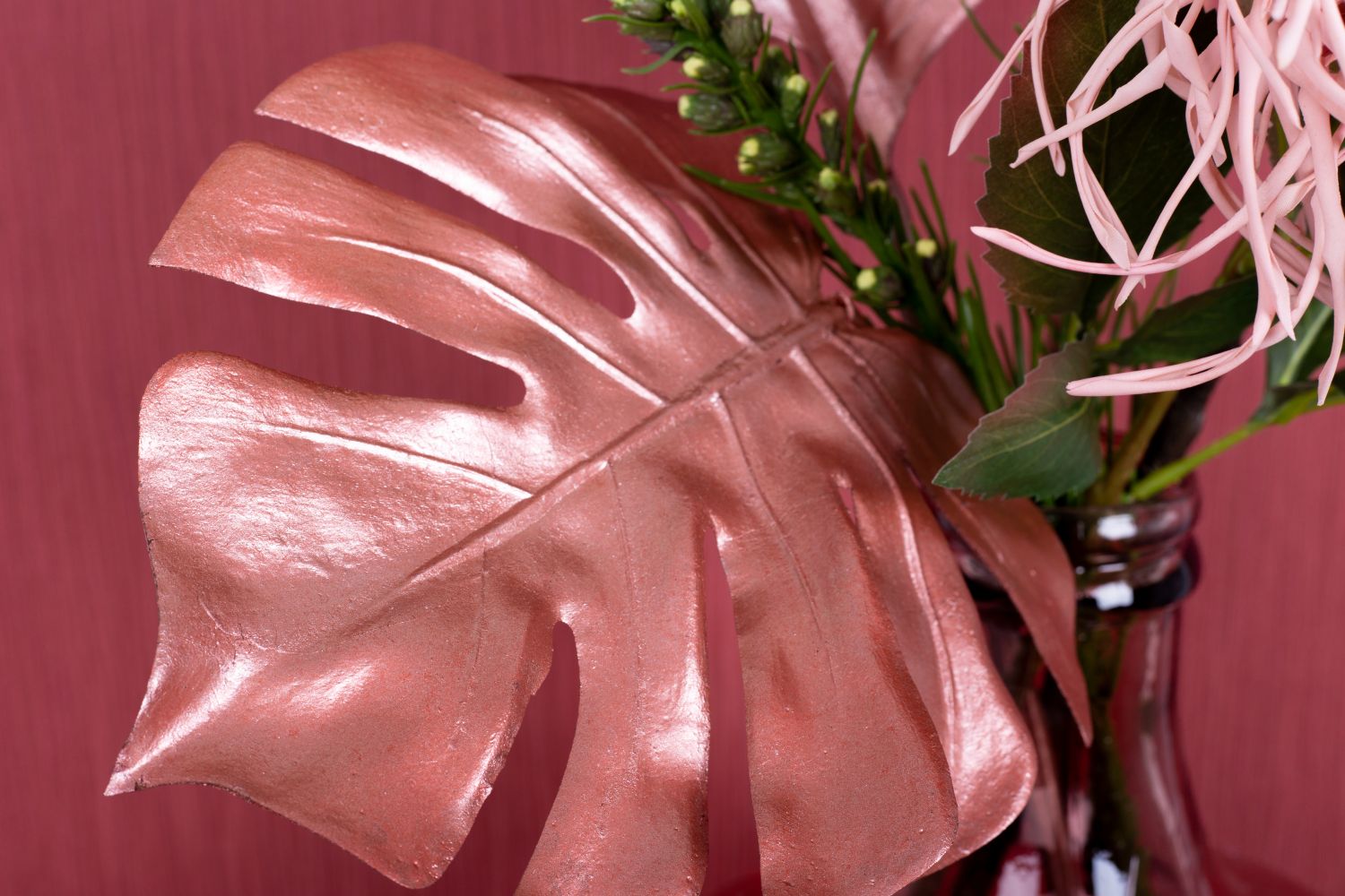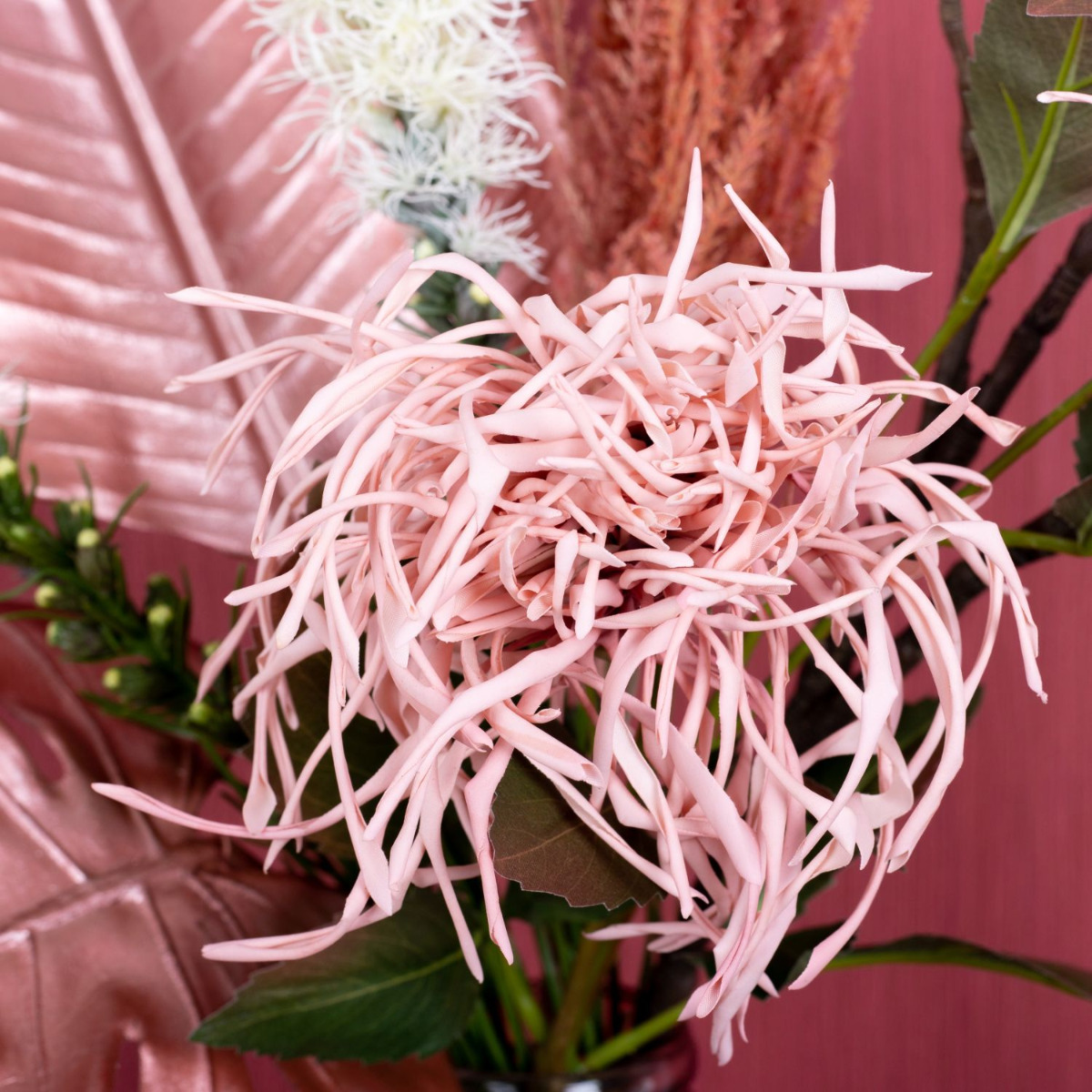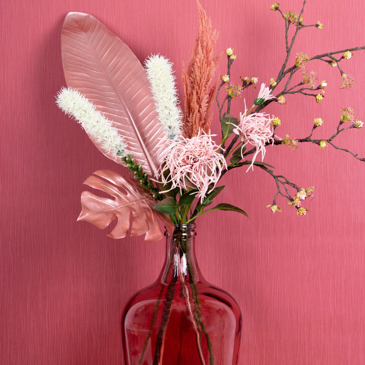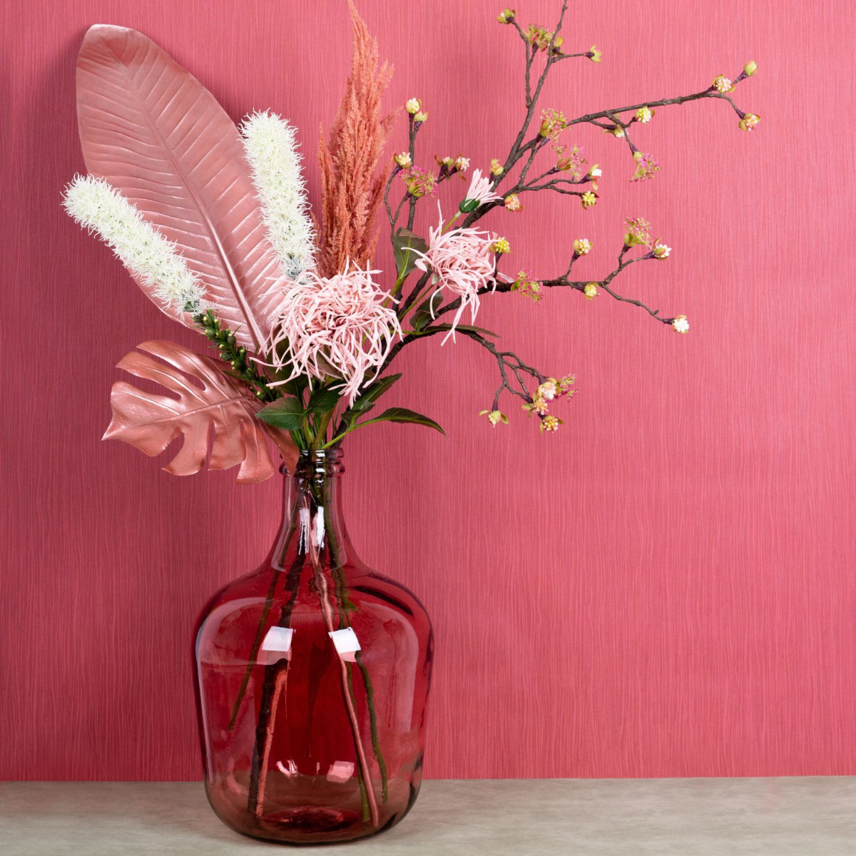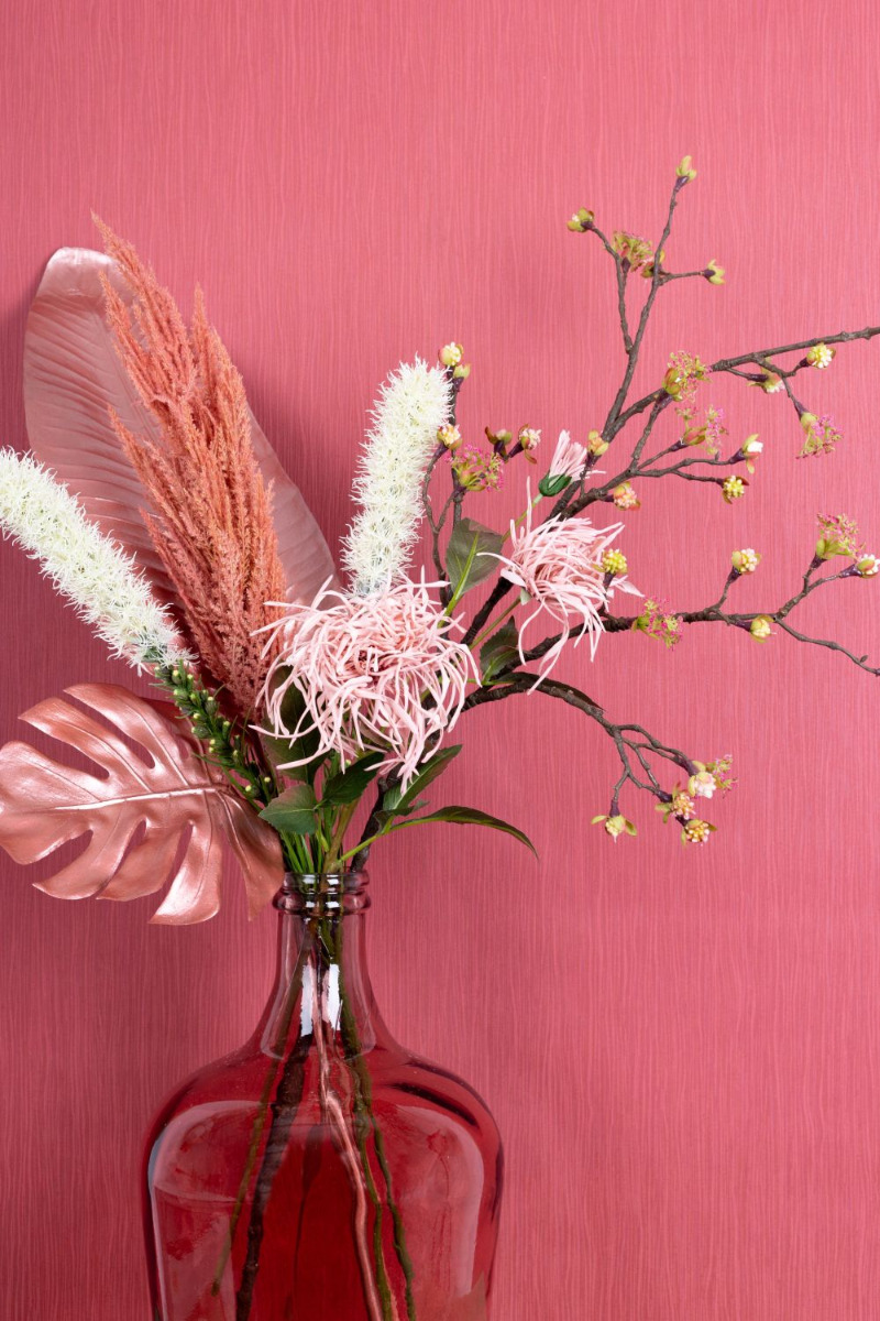 Cipria e fard! I colori tipici dell'estate sono spesso nella gamma dei cipriati. I toni del fard si armonizzano perfettamente con le foglie rosa metallizzato lucido. I fiori del ramo d'acero brillano dietro il design monocromatico del look e sembrano davvero magici in qualsiasi stanza! Per completare questo look molto femminile, abbiamo optato per un palloncino di vetro rosa. Si sposa perfettamente con lo sfondo rosa antico. Acquistate il look!