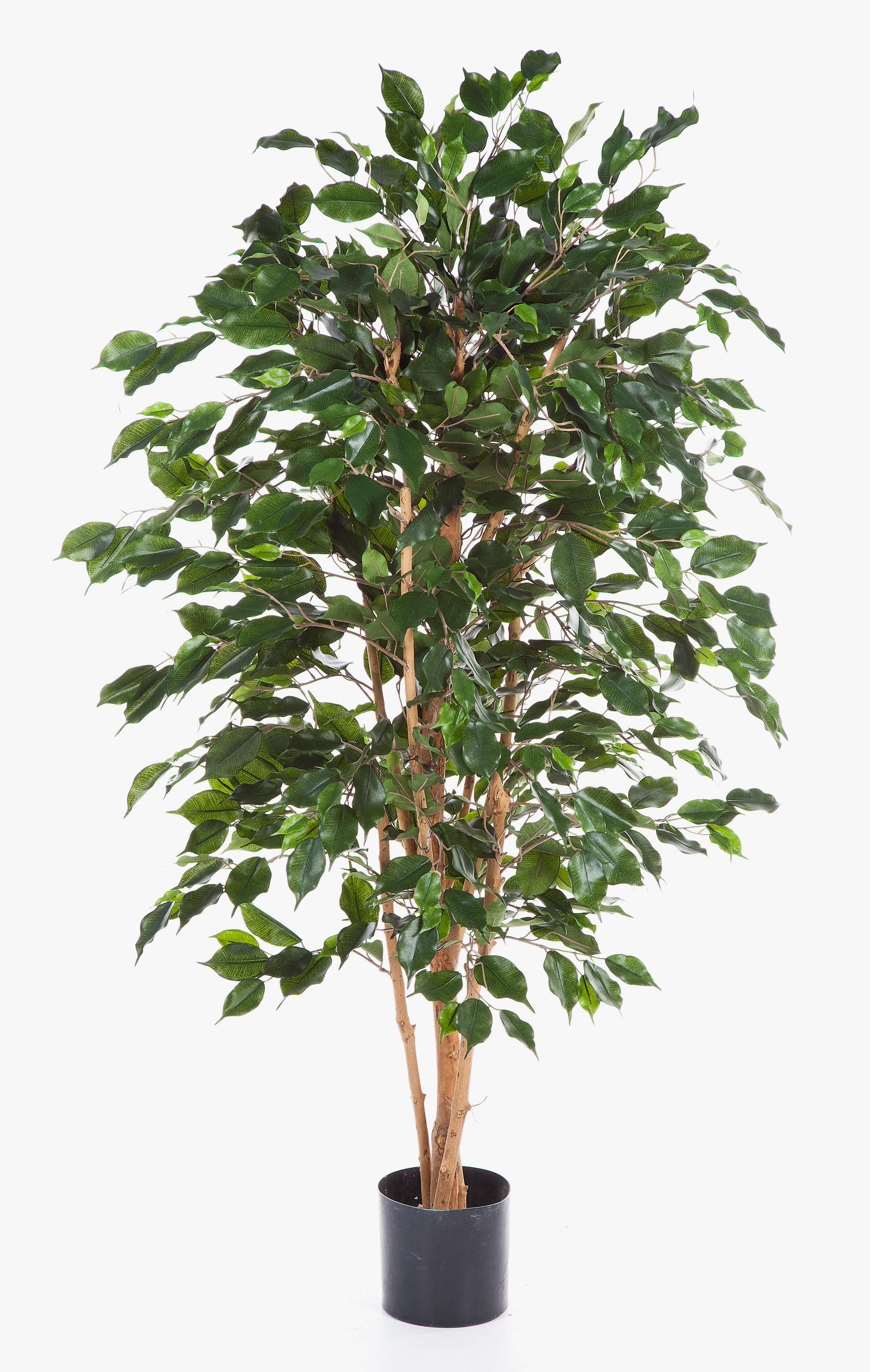 Ficus Benjamin artificiale con fogliame modello exotica. Questo albero decorativo ha una chioma folta, composta da circa 880 foglie finemente lavorate, e un'altezza di circa 150 cm comprensiva di base cementata, inserita in un vaso.
