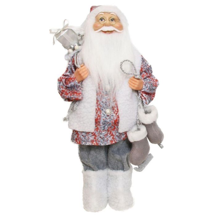 Figura di Babbo Natale ABENZIO, pattini da ghiaccio, sacco regali, bianco-grigio-rosso, 22x14x45cm