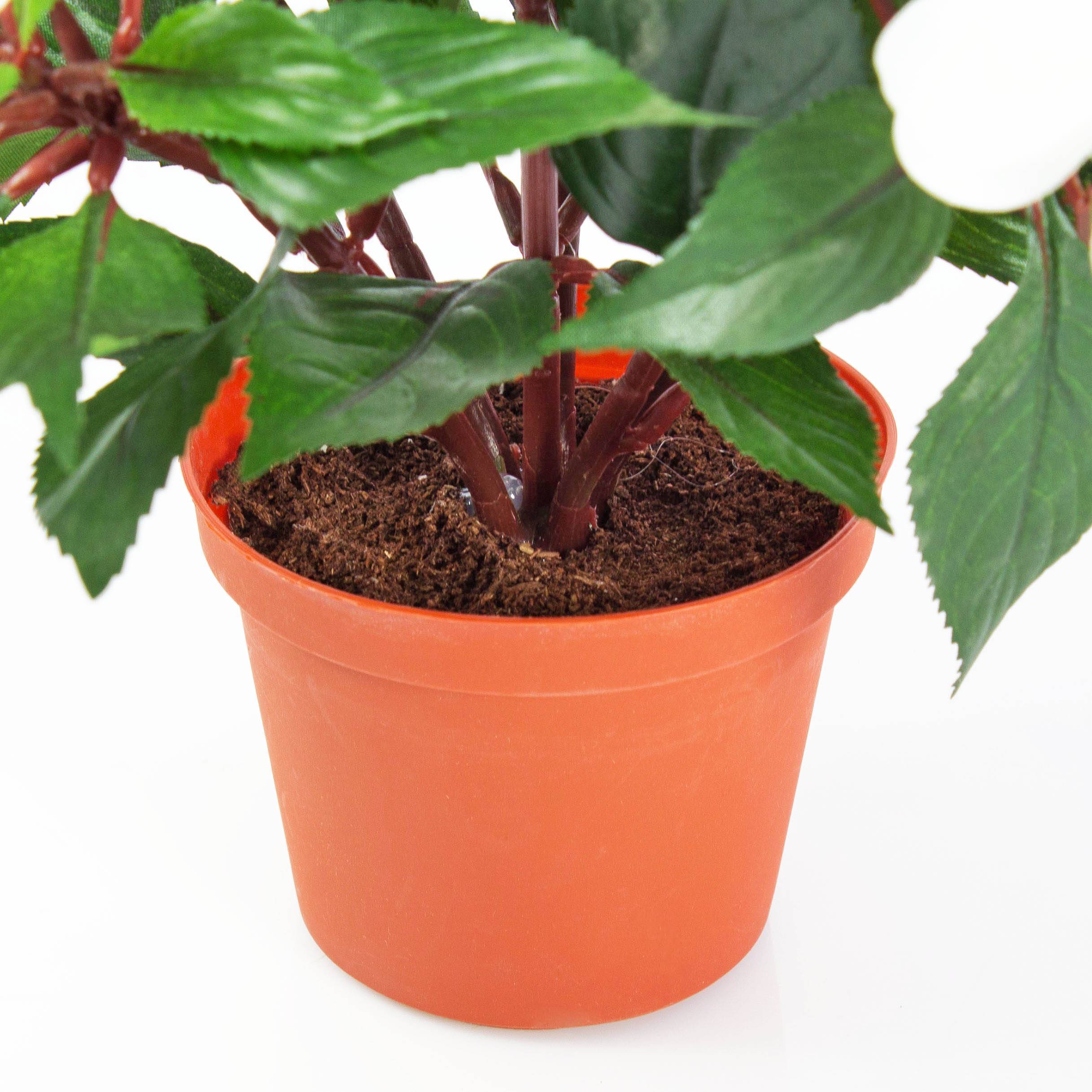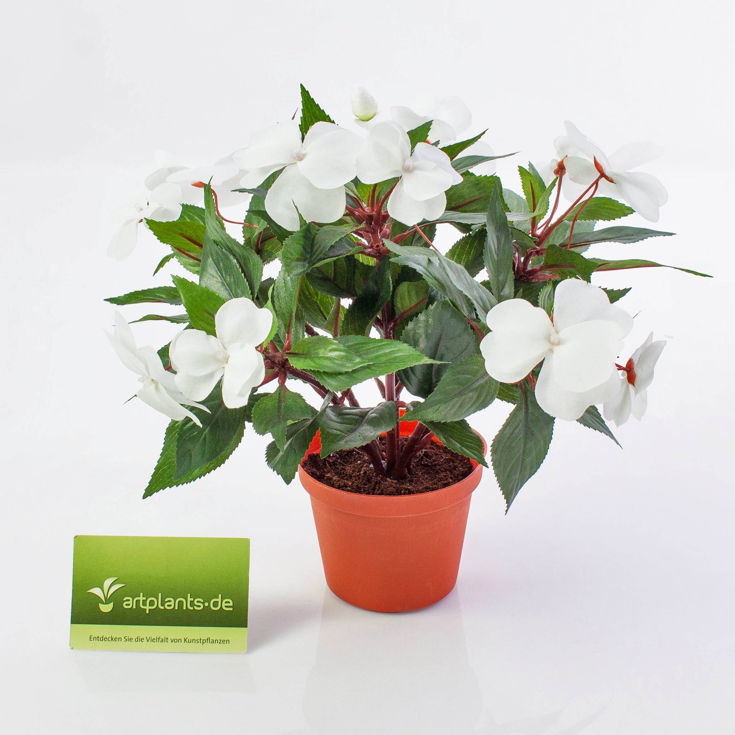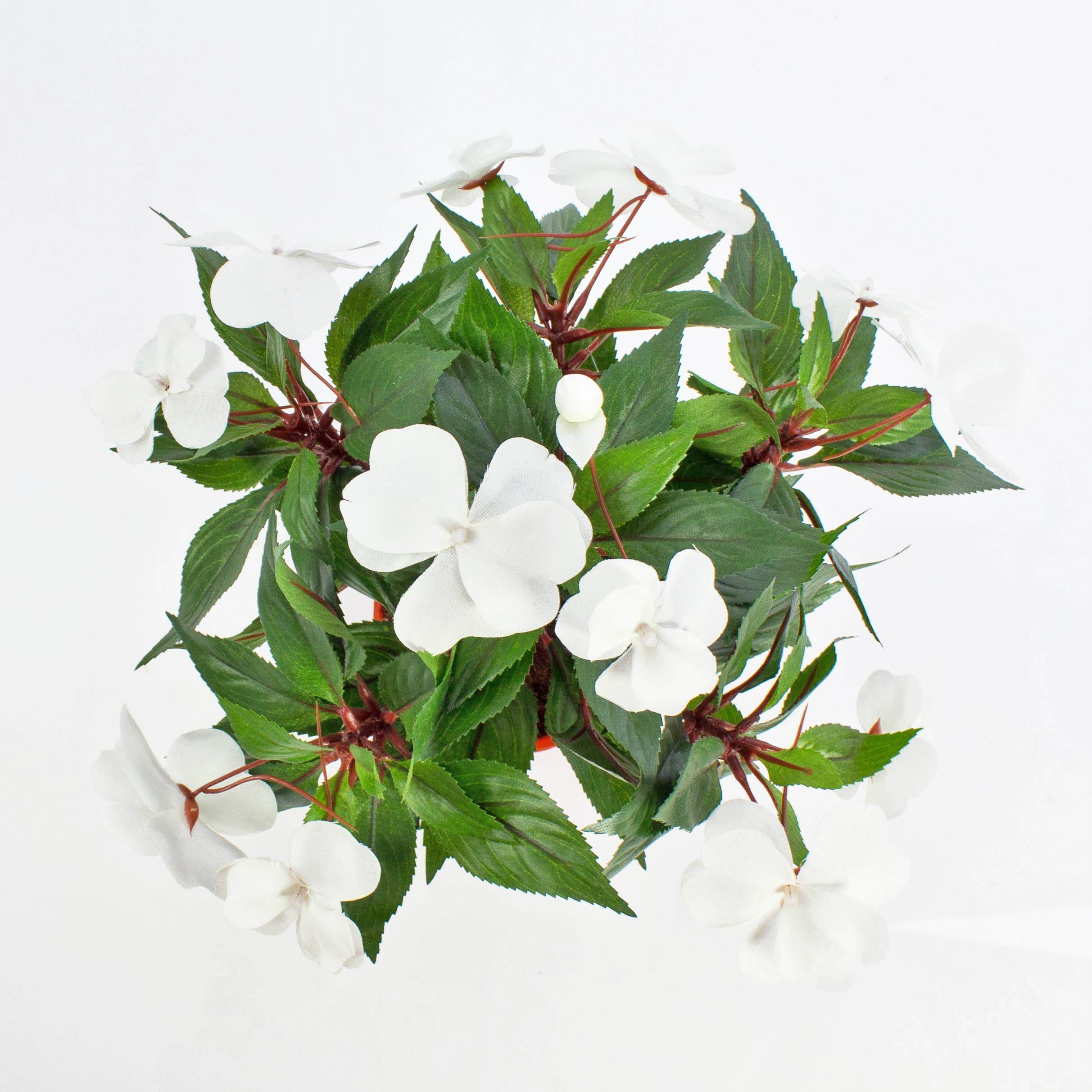 Fiore di lisetta (detto anche Impatiens walleriana o nuova guinea) artificiale con 13 fiori di colore crema-bianco e in vaso di materiale artificiale. Il fiore misura ca. 25 cm in altezza.