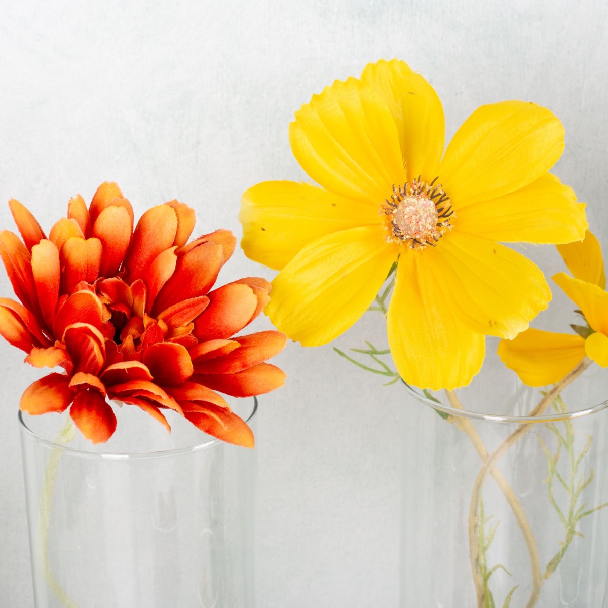 Suggerimento di allestimento: disponi i vasi a distanza regolare e i bicchieri piccoli leggermente sfalsati davanti. Non accorciare i gambi dei fiori, ma piegali a spirale in modo che entrino bene nei vasi. Riempi il bicchierino con muschio di un colore abbinato al fiore dietro di esso.