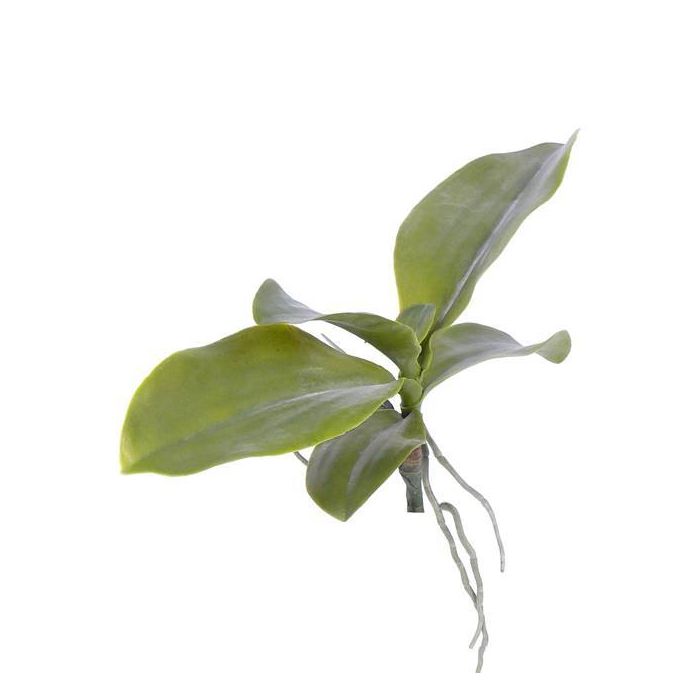 Foglie di orchidea artificiali di colore verde. Queste foglie di orchidea phalaenopsis hanno uno stelo artificiale per facilitarne l’inserimento all’interno di un vaso/fioriera e sono complete di numerose radici aeree.