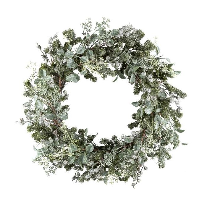 Ghirlanda artificiale eucalipto, abete DUVRA con fiori, congelata, verde-grigio, Ø60cm