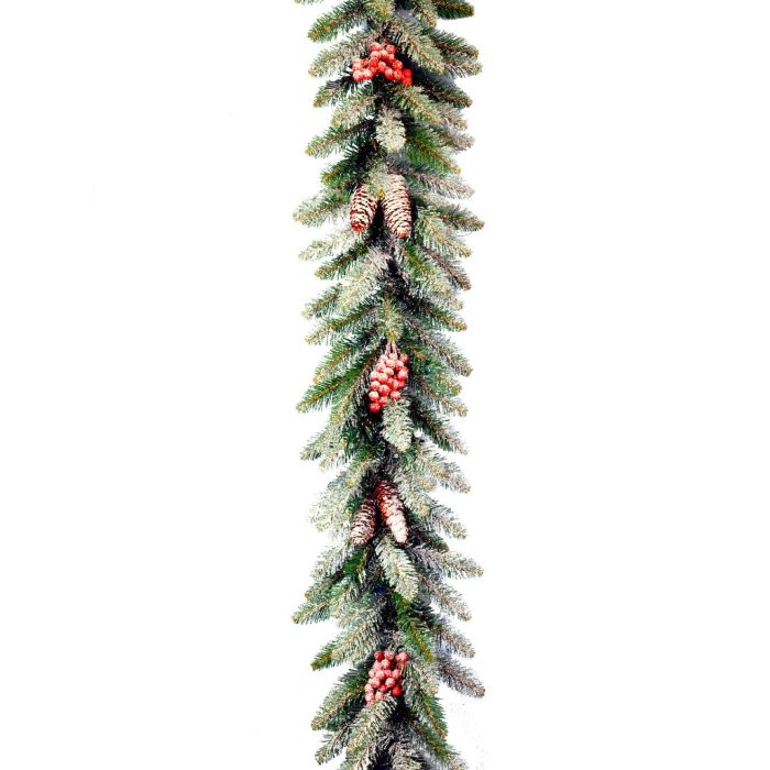 La ghirlanda finta di neve RAVENNA è realizzata con aghi in tessuto e decorata con pigne e bacche di abete.