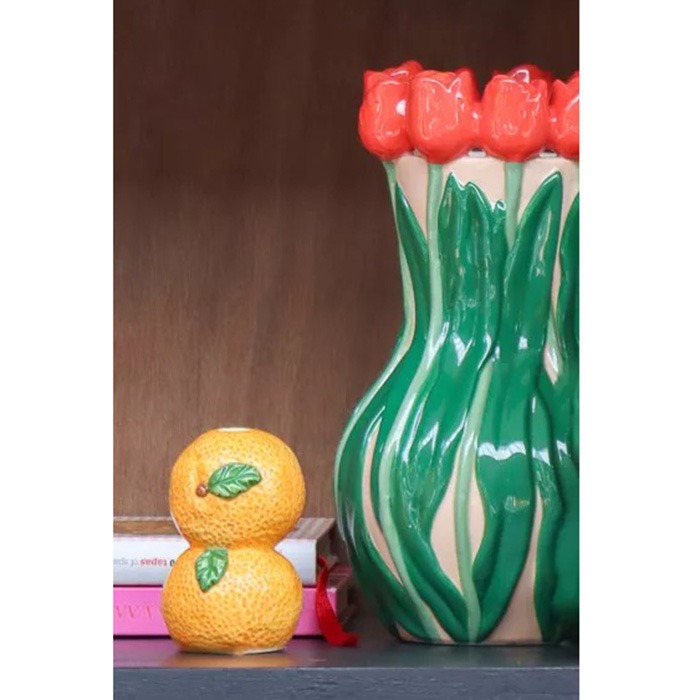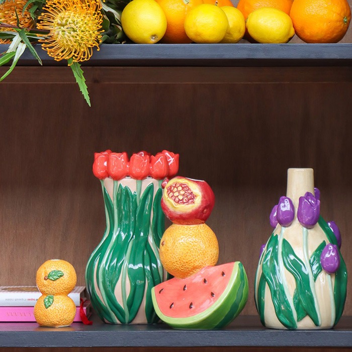 I frutti estivi incontrano i vasi primaverili! Un look perfetto sia per la primavera che per la (tarda) estate: oltre ai limoni e alle arance decorativi, anche il grazioso vaso singolo con motivo anguria-arancia-melograno fa venire voglia di frutta estiva. A dare ancora più colore sono i due vasi a tulipano che, grazie al loro aspetto realistico, non hanno nemmeno bisogno di fiori. Cardo blu e protea arancione-giallo completano questo ensemble colorato. Acquista il look!