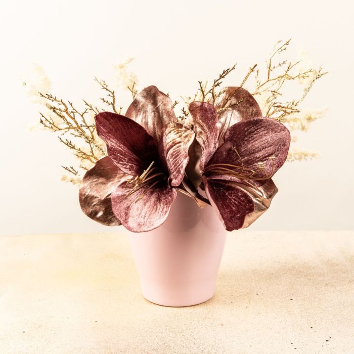 Rosato e oro! Una combinazione glamour che si adatta particolarmente bene alla stagione festiva. Il vaso rosa dell'orchidea si abbina perfettamente al colore vellutato dell'amarillide, simbolo di affetto e amicizia. I rami dorati e innevati aggiungono ulteriore splendore a questo look e mettono in risalto la bellezza dei fiori. Acquista il look!