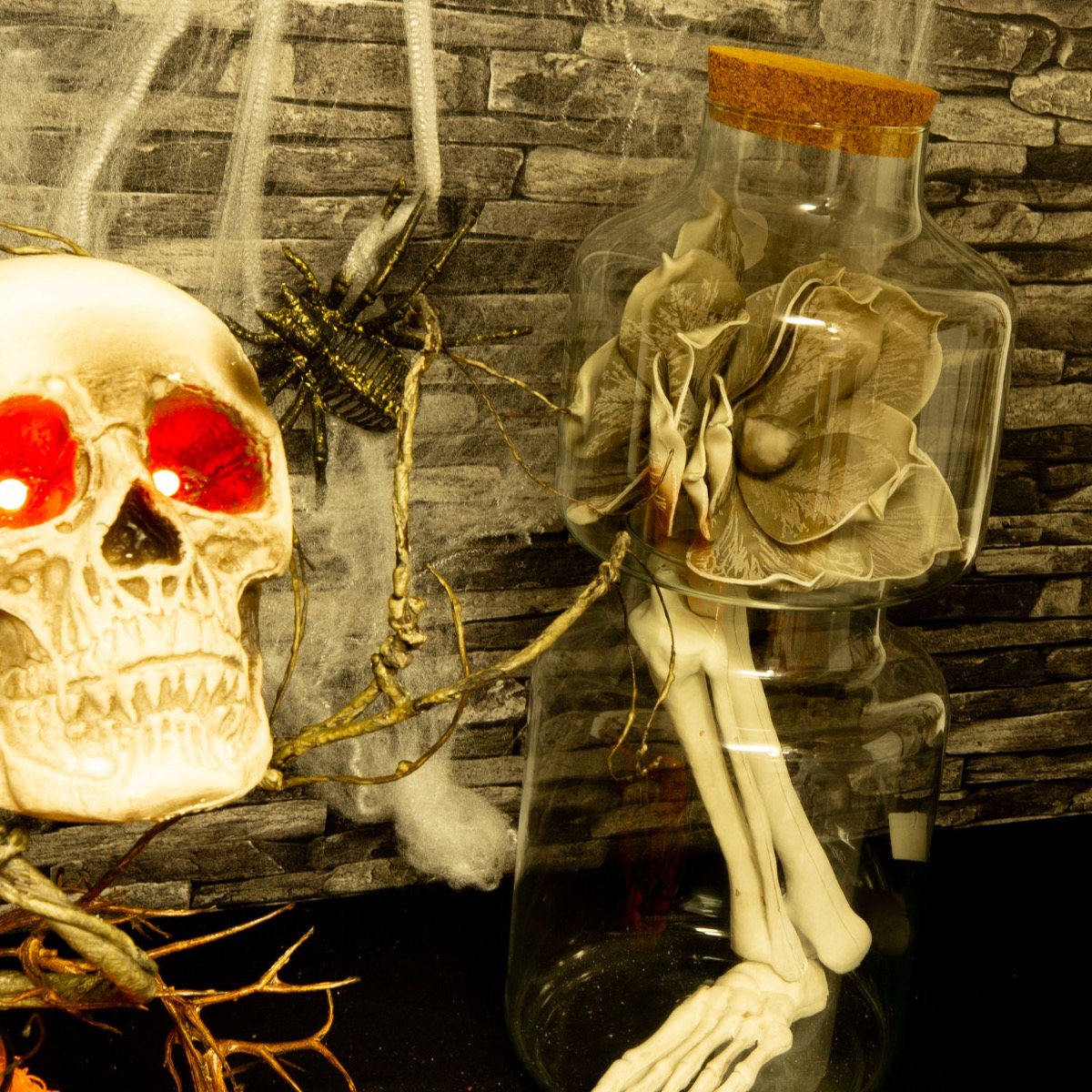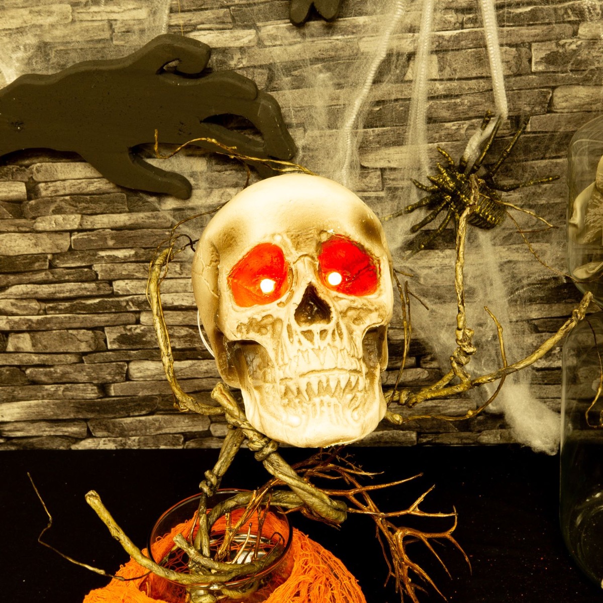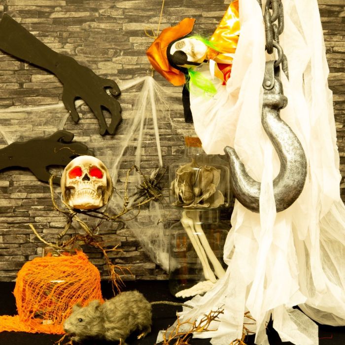 Pirata fantasma e teschio! Se amate i pirati vi ritroverete in questo look, una perfetta scena da film. Il pirata bianco con tunica da fantasma e frange pende dal soffitto su un'enorme catena molto realistica. Un teschio con occhi rossi luminosi è circondato da rami marroni. Un grande ragno siede nella ragnatela e un topo sembra attraversare il quadro. I grandi barattoli sono perfetti per essere riempiti con vari piccoli oggetti, nel nostro caso una gamba di scheletro e un fiore di plastica espansa. Una perfetta festa di Halloween a tema piratesco. Acquista il look!