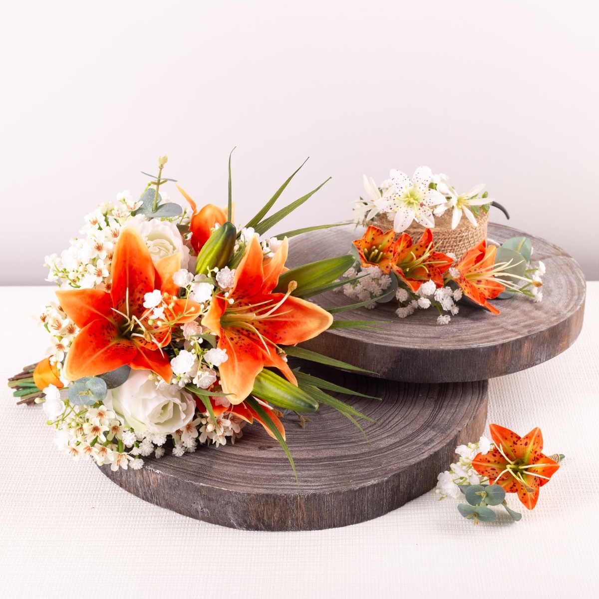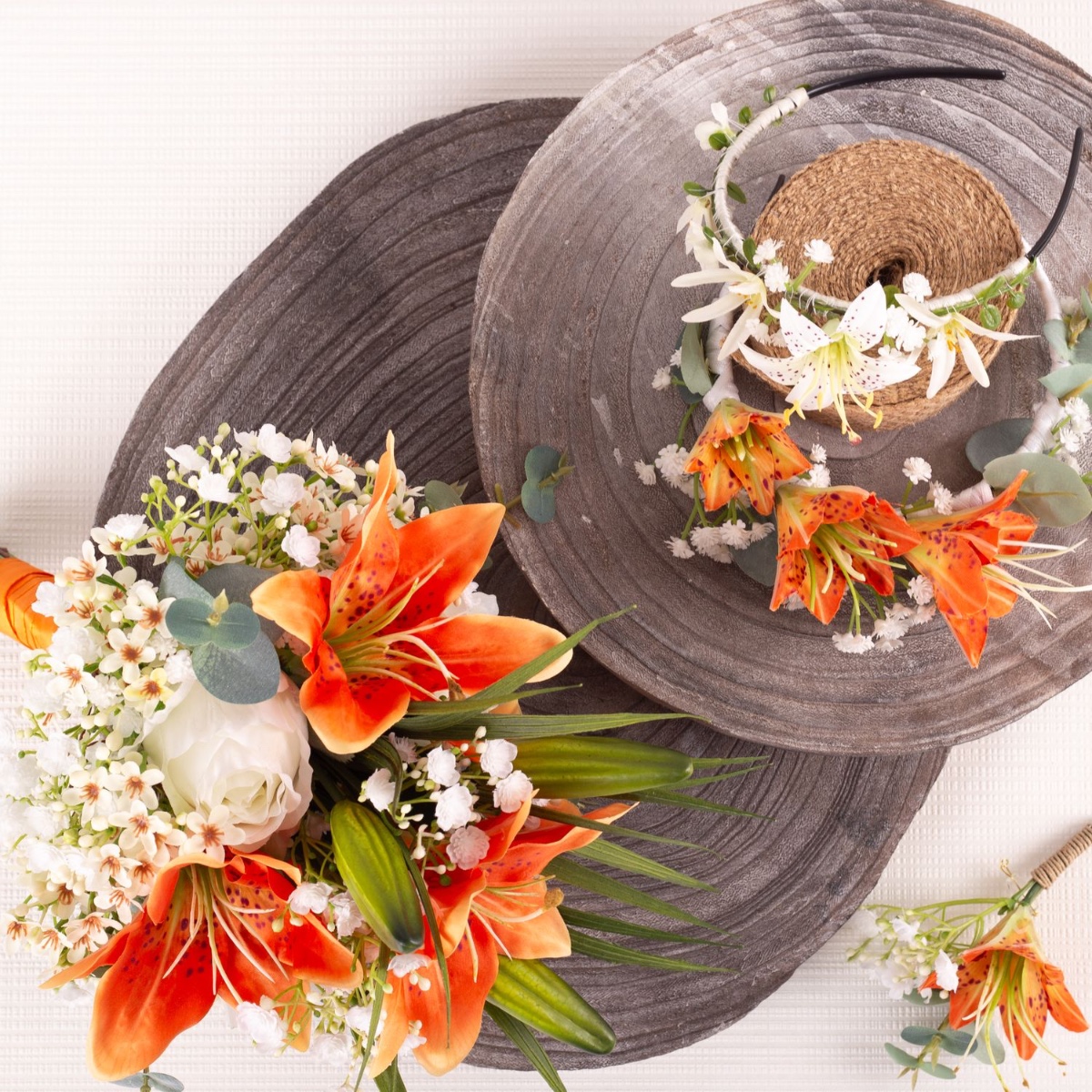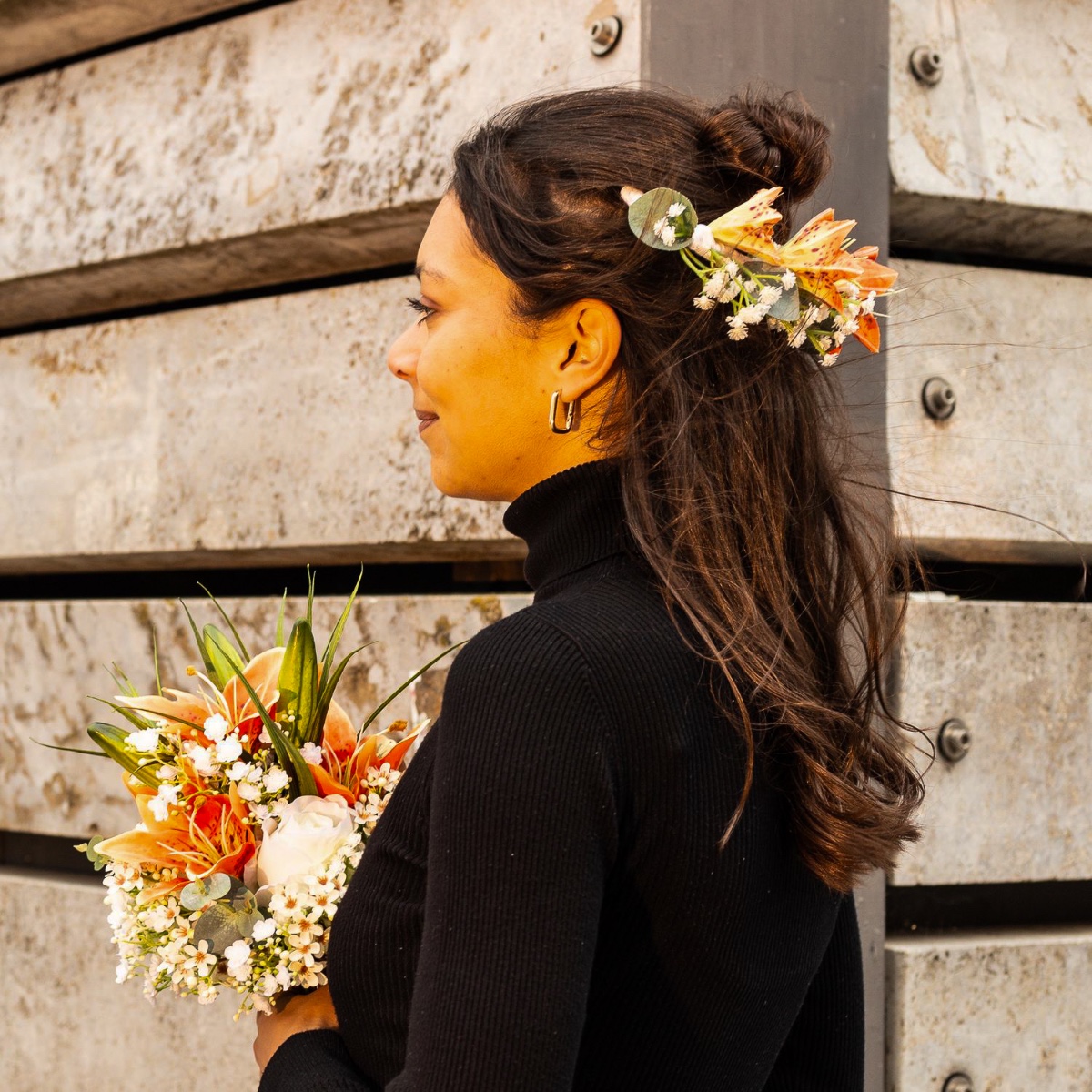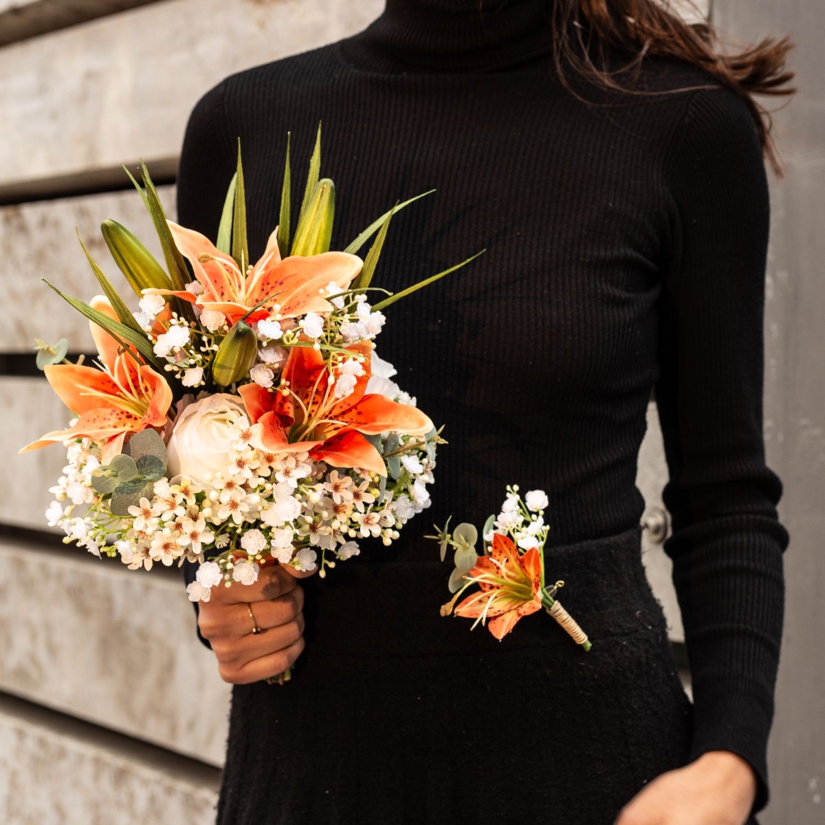 Arancione e bianco! I gigli arancioni della serie EMIKO non potevano mancare nel bouquet da sposa di Tamara. Questi fiori tessili luminosi non sono solo belli, ma hanno anche un significato appropriato per un matrimonio. Il fiore del giglio arancione simboleggia la passione, la felicità e la gioia. Inoltre, hanno una fioritura affascinante che rende elegante ogni bouquet. Il nostro team creativo ha realizzato anche i gioielli per capelli abbinati, sotto forma di cerchietti per Tamara e la sua damigella d'onore, nonché una spilla abbinata per l'uomo. Una combinazione perfetta per questa occasione speciale. Acquista il look!