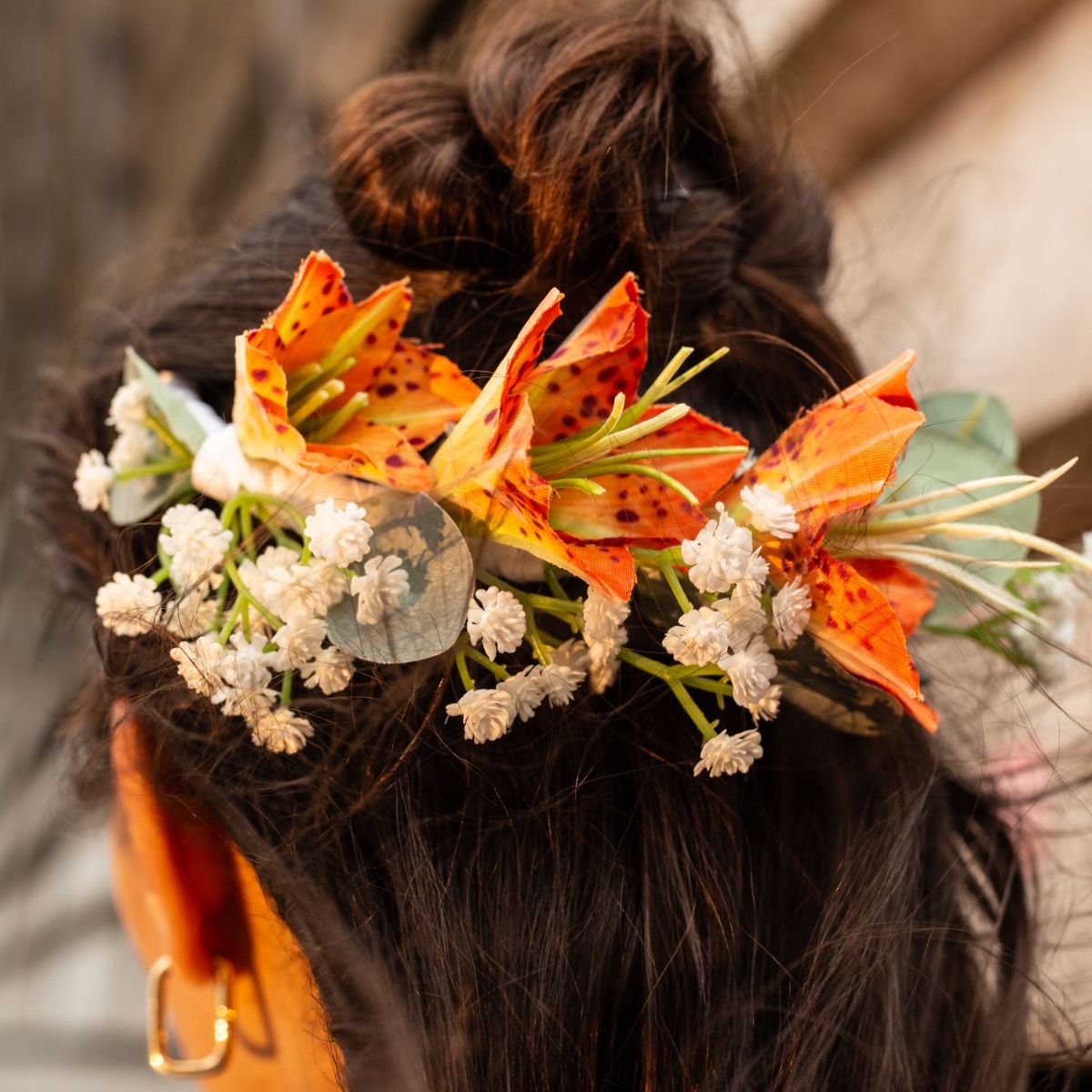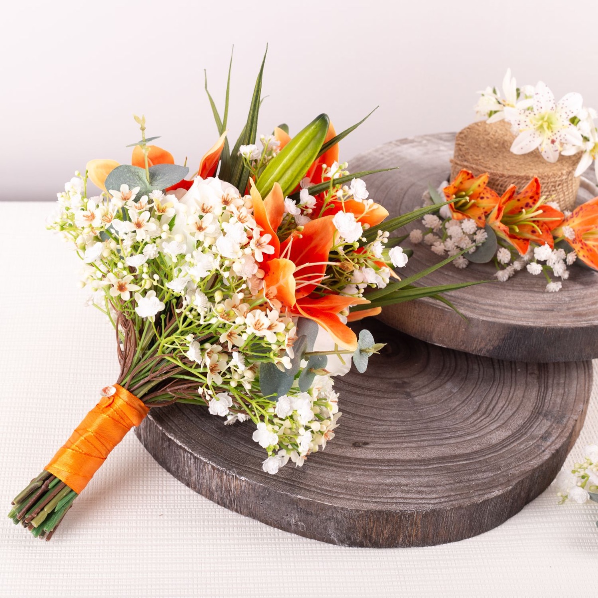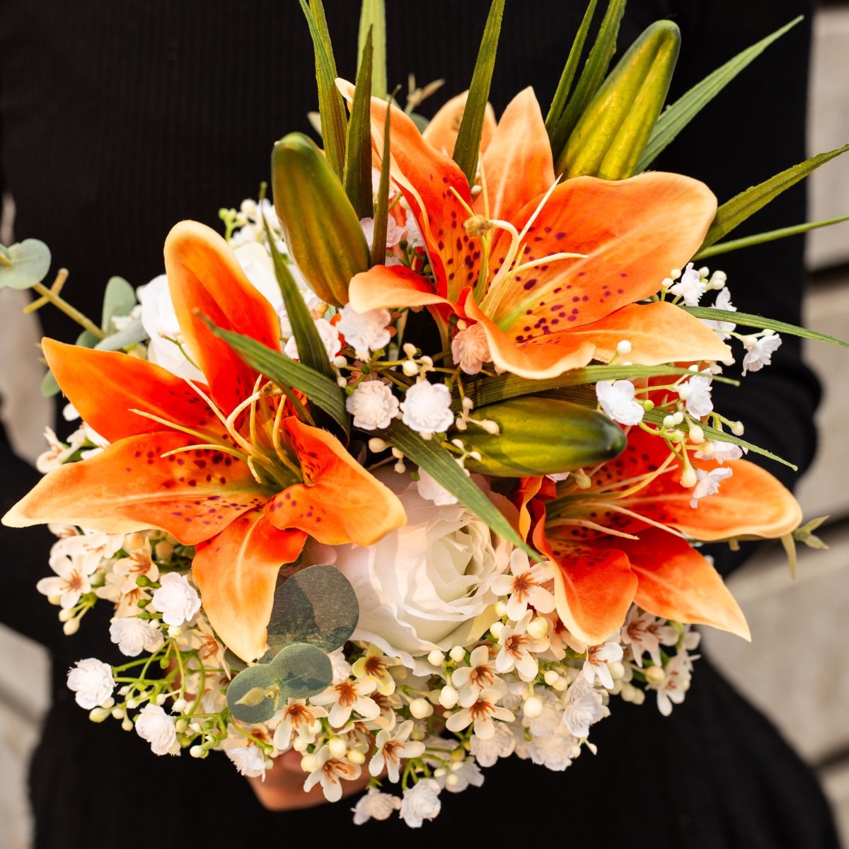 Arancione e bianco! I gigli arancioni della serie EMIKO non potevano mancare nel bouquet da sposa di Tamara. Questi fiori tessili luminosi non sono solo belli, ma hanno anche un significato appropriato per un matrimonio. Il fiore del giglio arancione simboleggia la passione, la felicità e la gioia. Inoltre, hanno una fioritura affascinante che rende elegante ogni bouquet. Il nostro team creativo ha realizzato anche i gioielli per capelli abbinati, sotto forma di cerchietti per Tamara e la sua damigella d'onore, nonché una spilla abbinata per l'uomo. Una combinazione perfetta per questa occasione speciale. Acquista il look!
