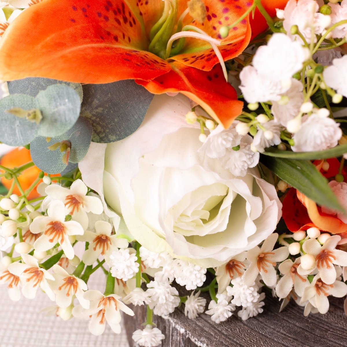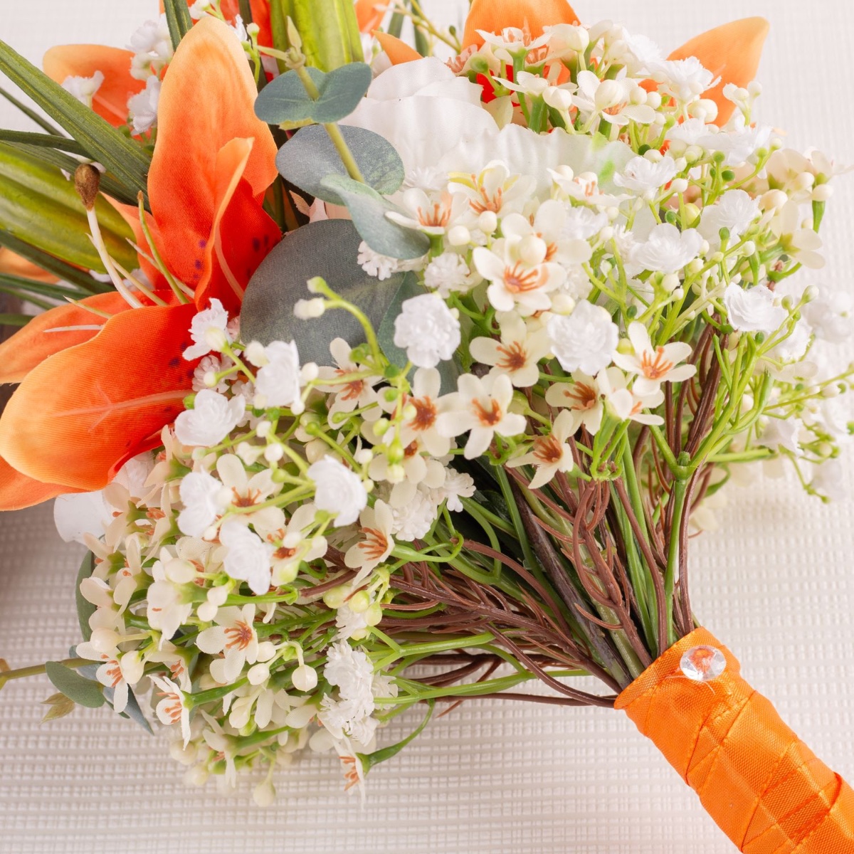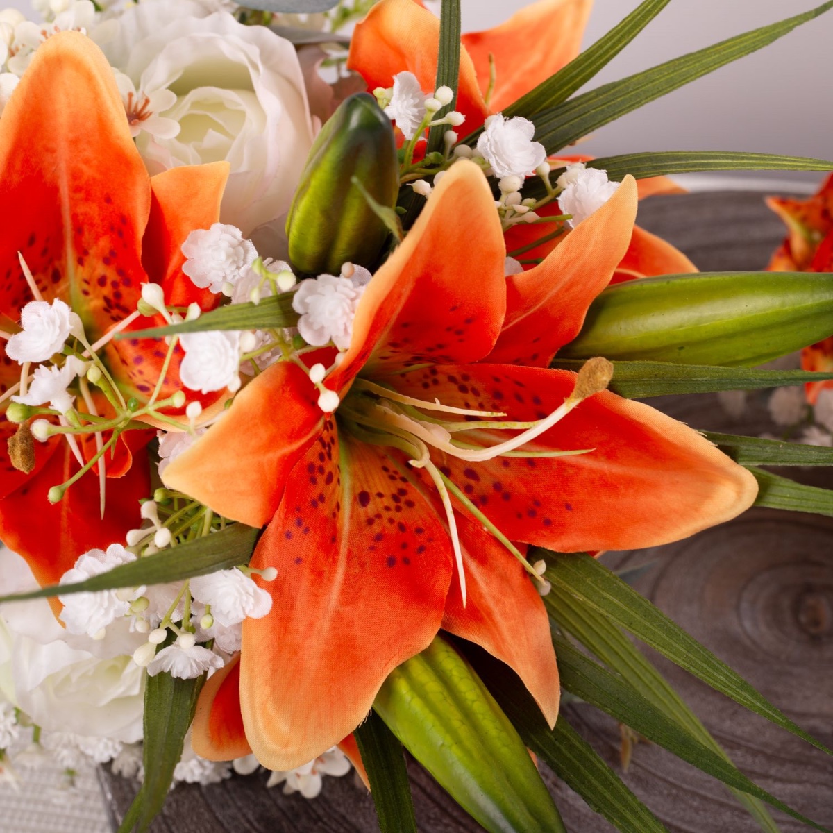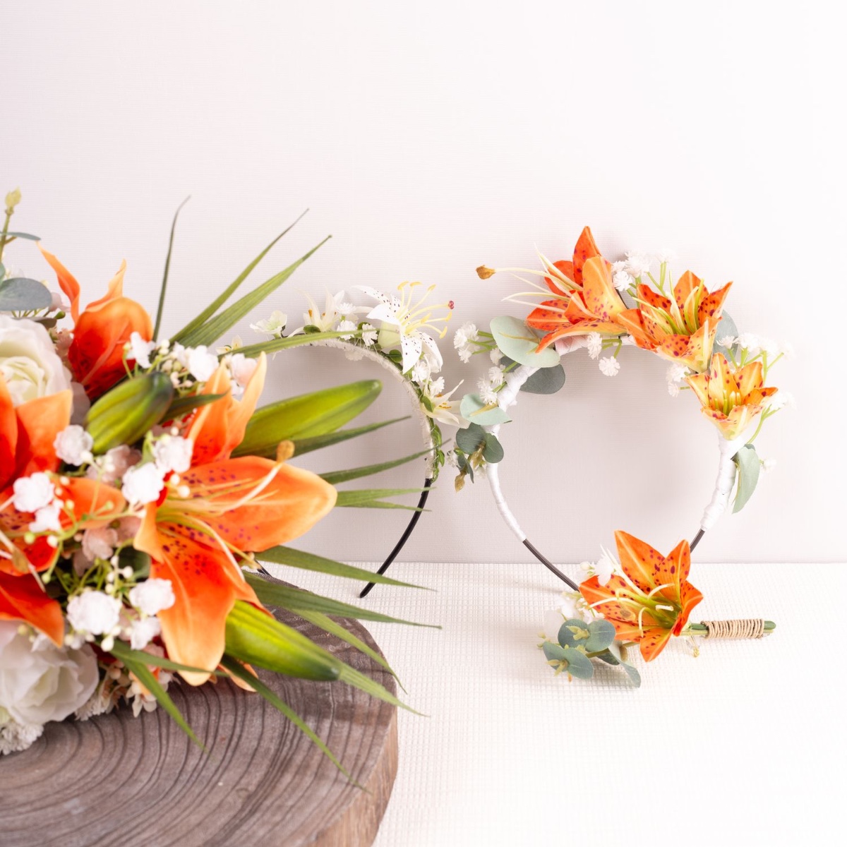 Arancione e bianco! I gigli arancioni della serie EMIKO non potevano mancare nel bouquet da sposa di Tamara. Questi fiori tessili luminosi non sono solo belli, ma hanno anche un significato appropriato per un matrimonio. Il fiore del giglio arancione simboleggia la passione, la felicità e la gioia. Inoltre, hanno una fioritura affascinante che rende elegante ogni bouquet. Il nostro team creativo ha realizzato anche i gioielli per capelli abbinati, sotto forma di cerchietti per Tamara e la sua damigella d'onore, nonché una spilla abbinata per l'uomo. Una combinazione perfetta per questa occasione speciale. Acquista il look!