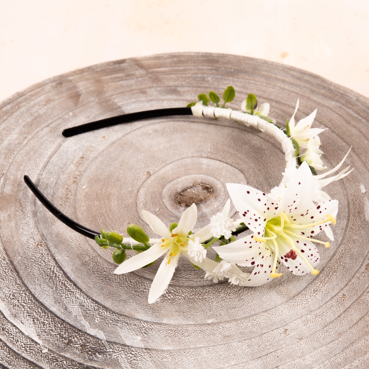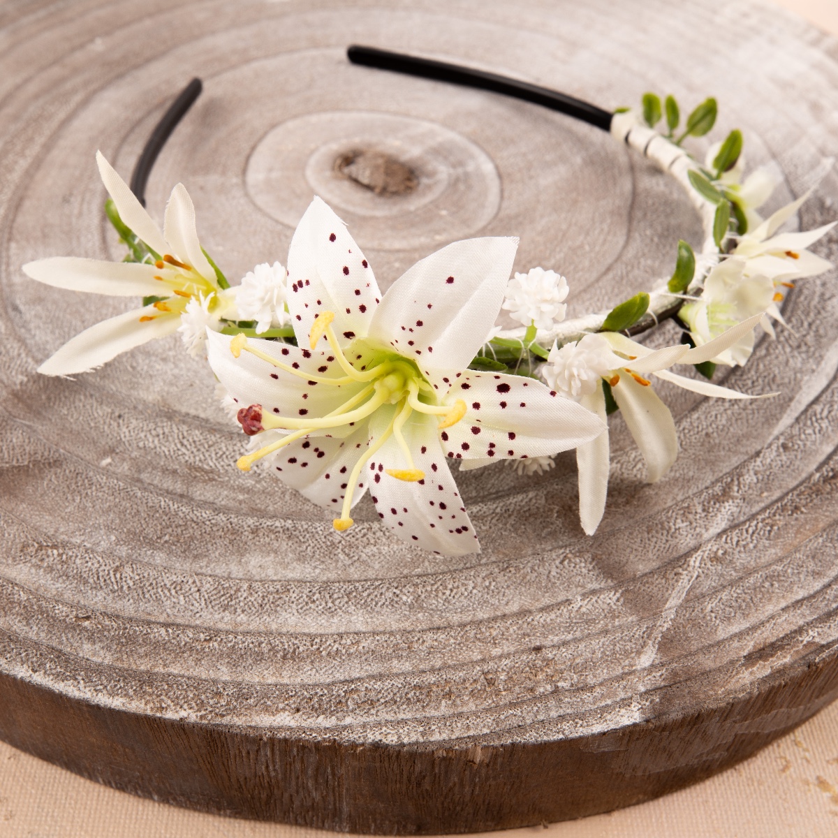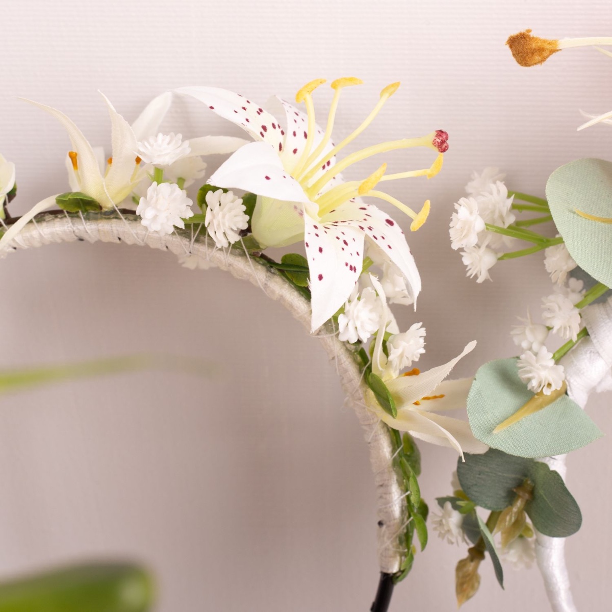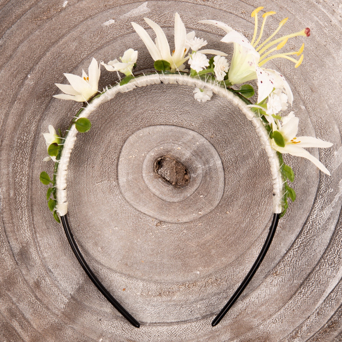 Cerchio da damigella, giglio bianco: Per questa versione, abbiamo prima avvolto il nastro di raso intorno al cerchietto. I fiori e le foglie sono stati prima fissati con un po' di colla a caldo e poi cuciti con ago e filo. Questo ha il vantaggio che i piccoli pezzi possono essere utilizzati anche come gioielli per capelli. Le perle, ad esempio, possono essere facilmente incorporate nel cerchietto in questo modo.