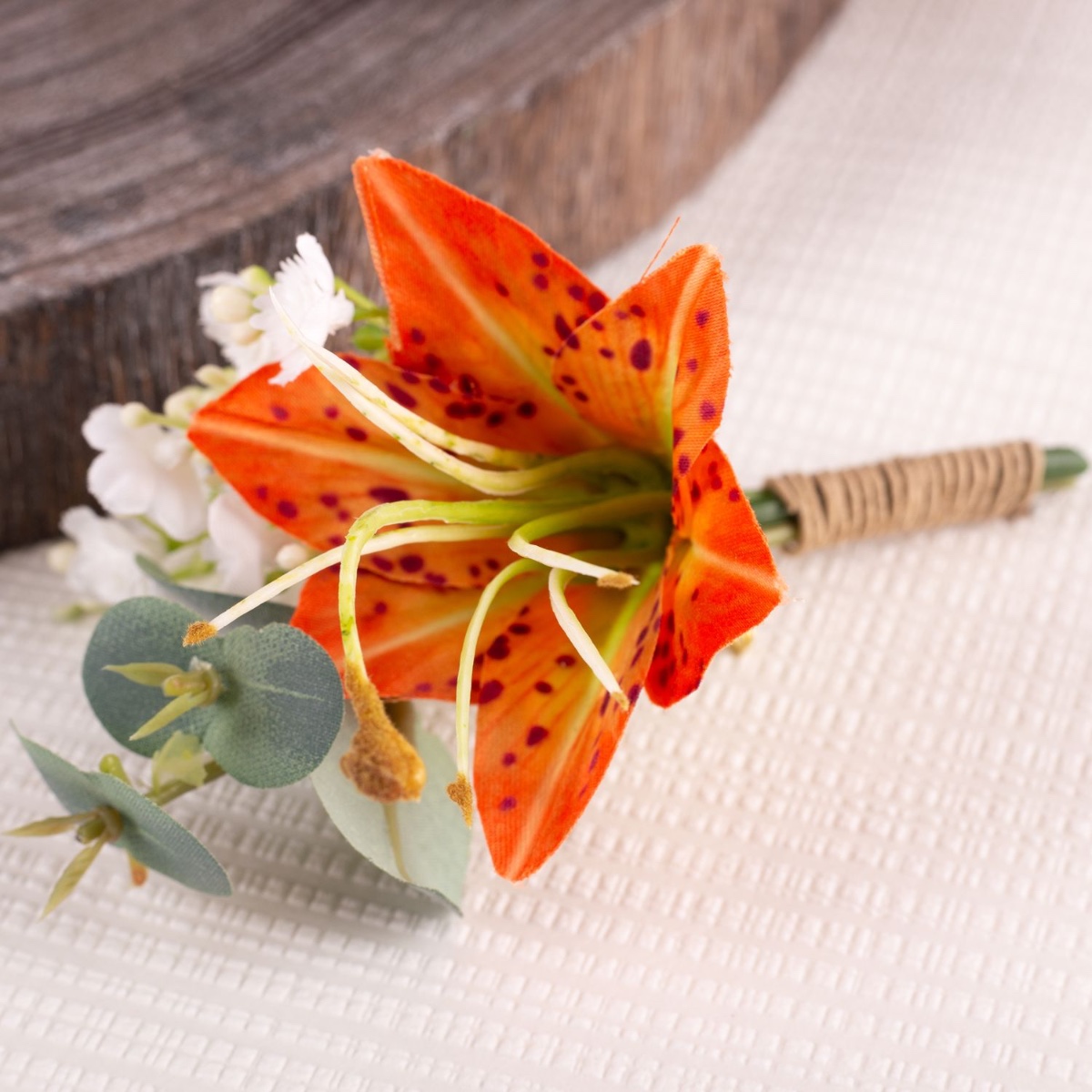 Spilla da uomo: La spilla da uomo può essere facilmente realizzata con alcuni ritagli di tessuto. Anche in questo caso, il giglio deve essere prima tagliato nella misura desiderata. Il piccolo bouquet può poi essere fissato alla spilla con un filo di ferro avvolto nella carta.