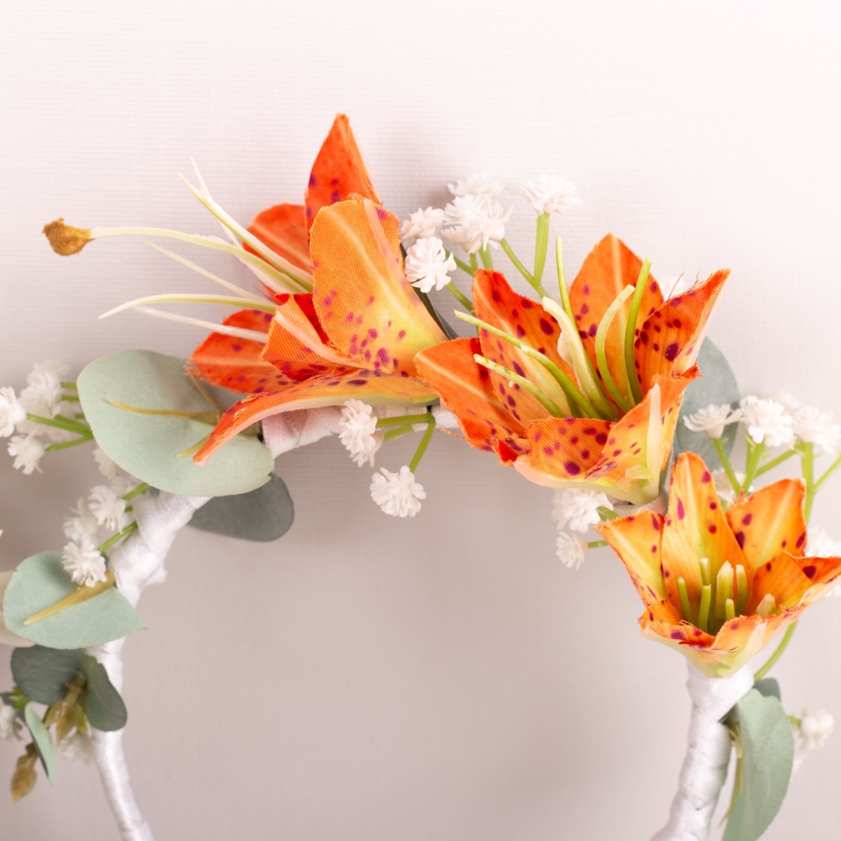 Cerchio per la sposa, giglio arancione: Per prima cosa abbiamo tagliato i gigli in 3 misure diverse con le forbici. Poi sono stati attaccati al diadema con la colla a caldo. I fiori devono essere posizionati in modo che puntino in avanti o verso l'alto. Anche questi vengono attaccati con del filo da cucito. Procedere allo stesso modo con la gypsophila e l'eucalipto. Infine, prendete un nastro di raso largo 0,5 cm e avvolgetelo intorno al cerchietto in modo che gli steli attaccati non siano più visibili. Fissate il tutto con la colla a caldo.