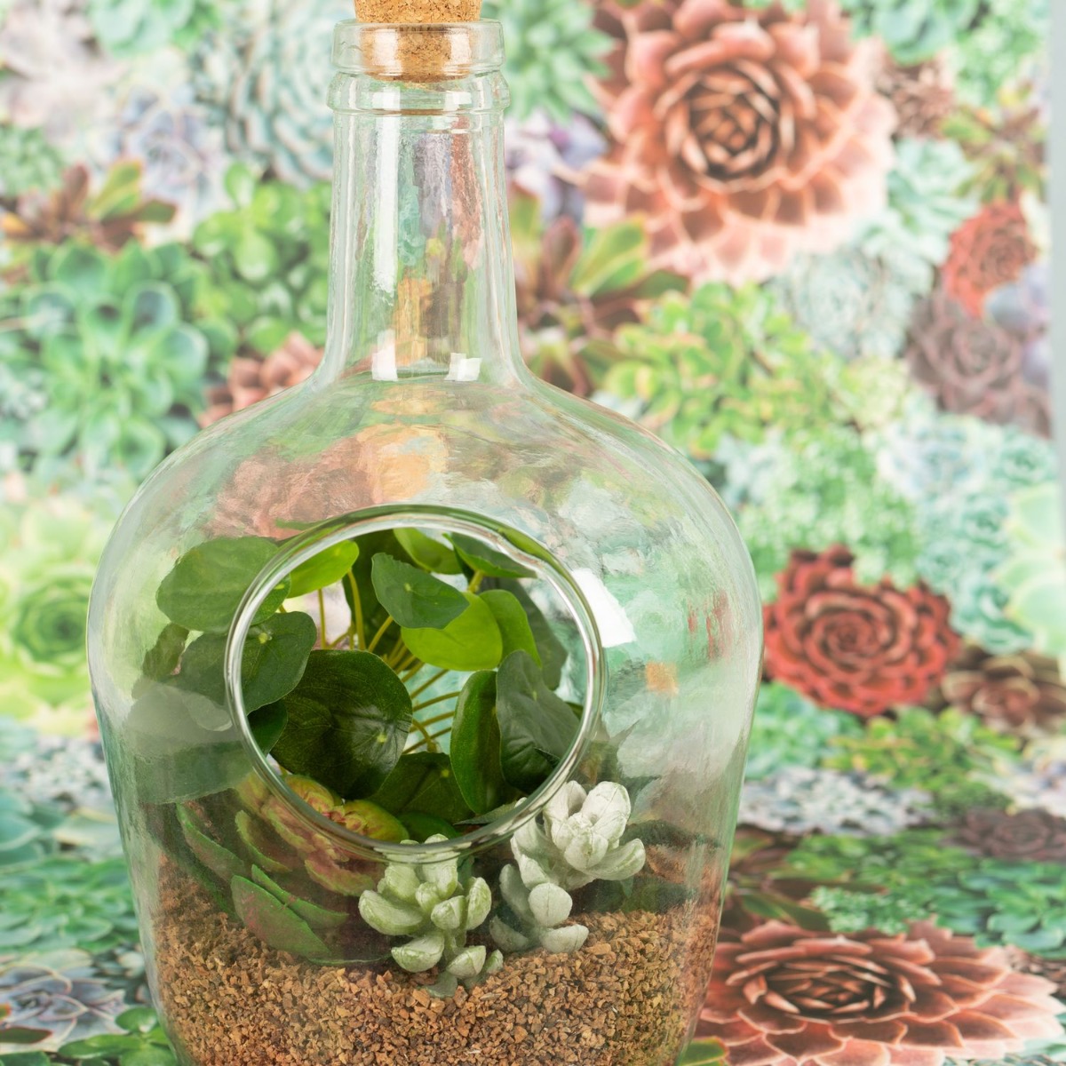 Consiglio di design: Mettete i granuli di sughero nella bottiglia e distribuite le piante grasse in modo che ogni elemento sia visibile. Quelle grandi dietro, quelle piccole davanti.