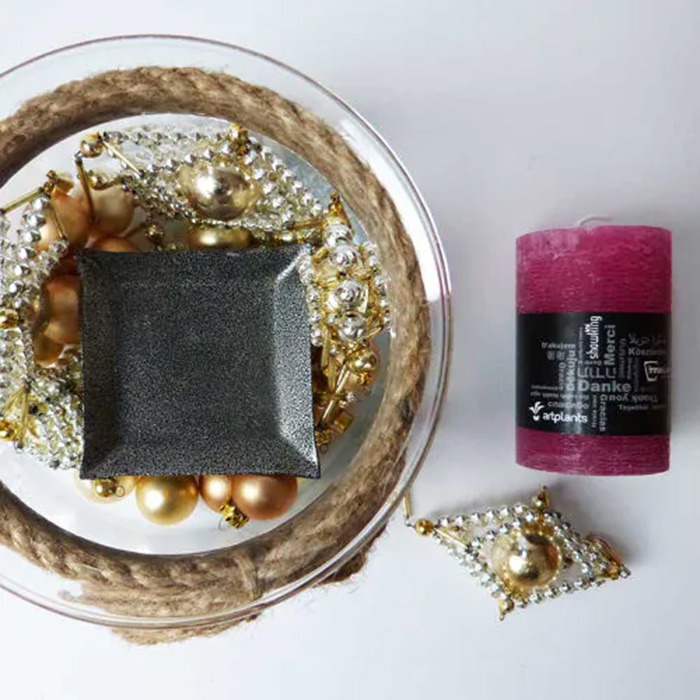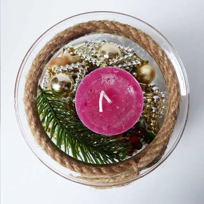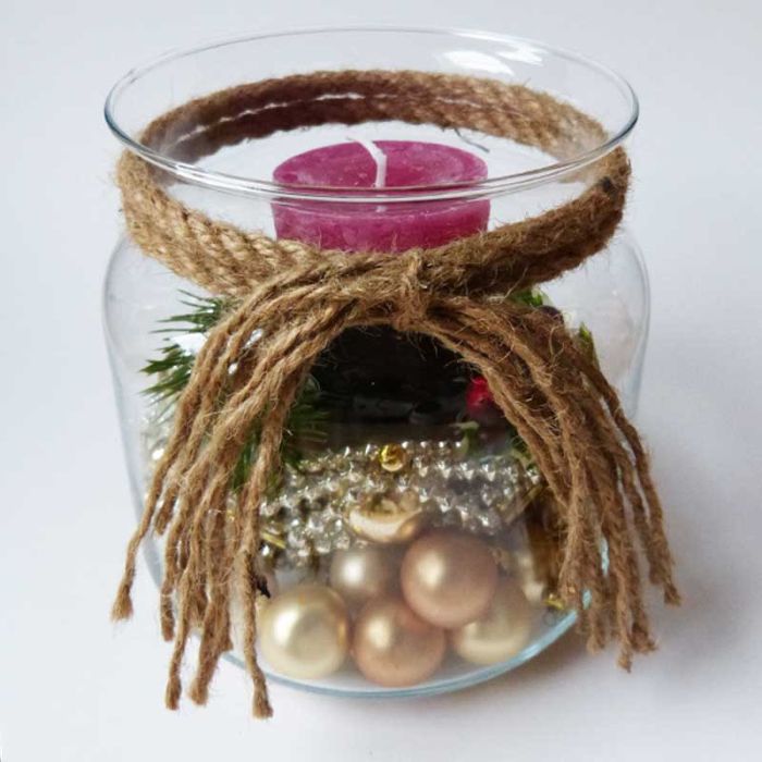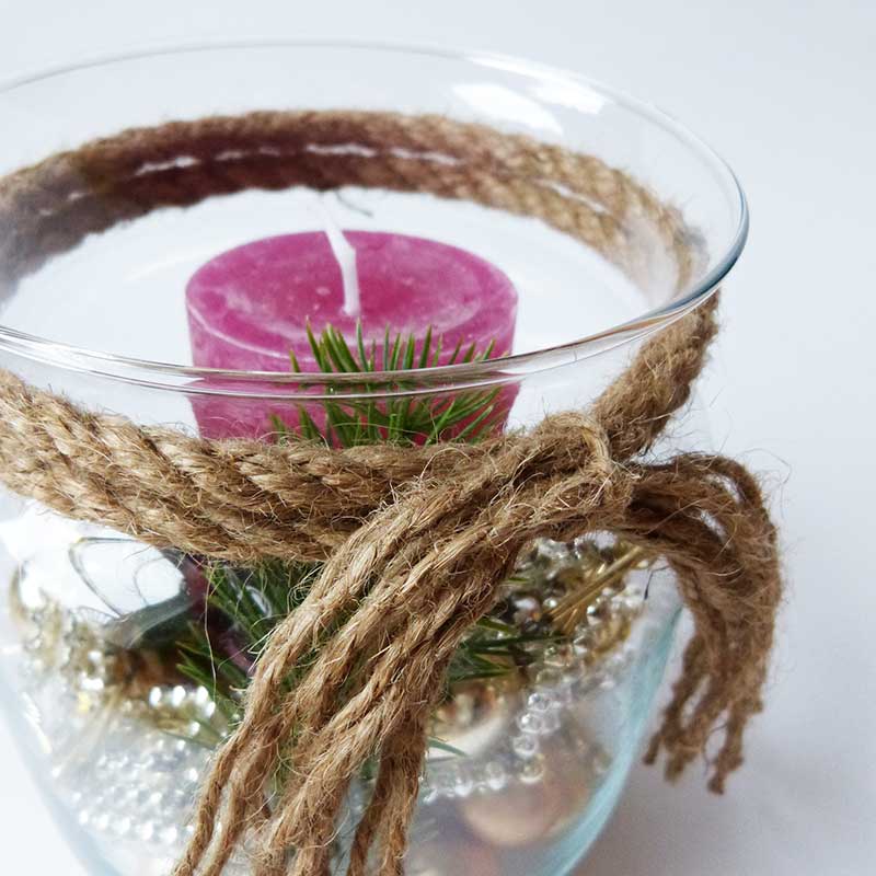 Suggerimento per il design: prima di tutto collocate le decorazioni nel bicchiere, poi posizionate il portacandele e la candela. Se necessario, accorciare leggermente il ramo di abete o tagliarlo in singoli rami.