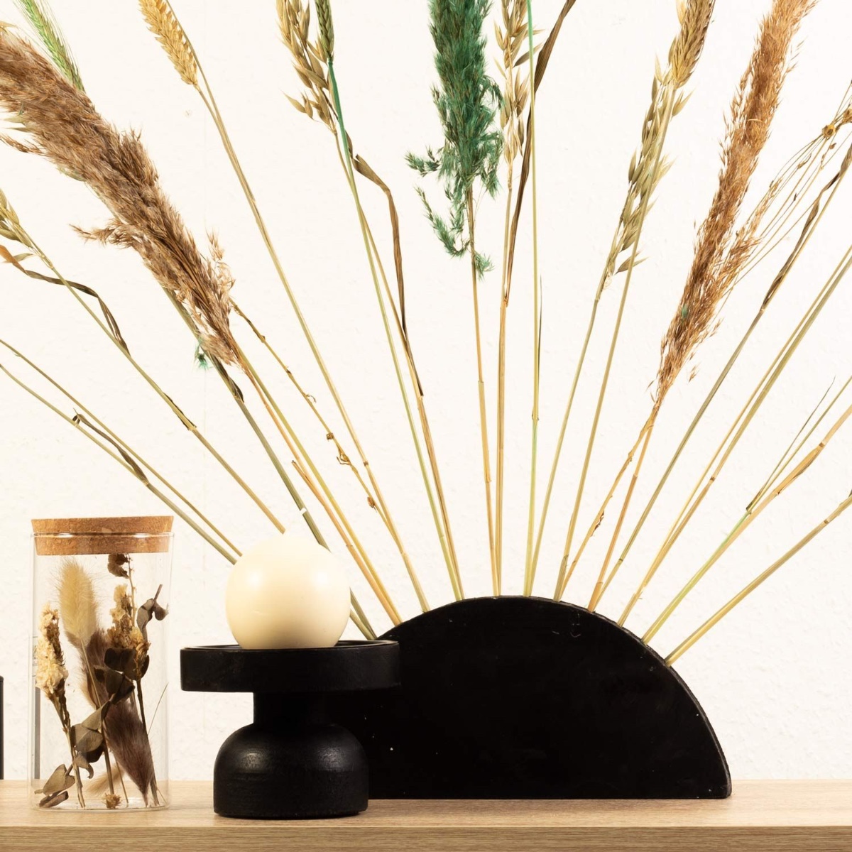 Menta e marrone chiaro! Questo modello è realizzato esclusivamente con materiali naturali ed è quindi assolutamente alla moda. Il supporto semicircolare in legno è perfetto per decorare con fiori secchi, che possono essere facilmente inseriti nel bicchiere con coperchio in sughero, anch'esso riempito con delicati fiori secchi, si fonde molto bene e migliora l'aspetto naturale. Il portacandele rotondo in legno si abbina perfettamente al colore e può essere combinato con molte forme di candele diverse. Una bellissima decorazione per tutti gli amanti della natura su Acquista il look!