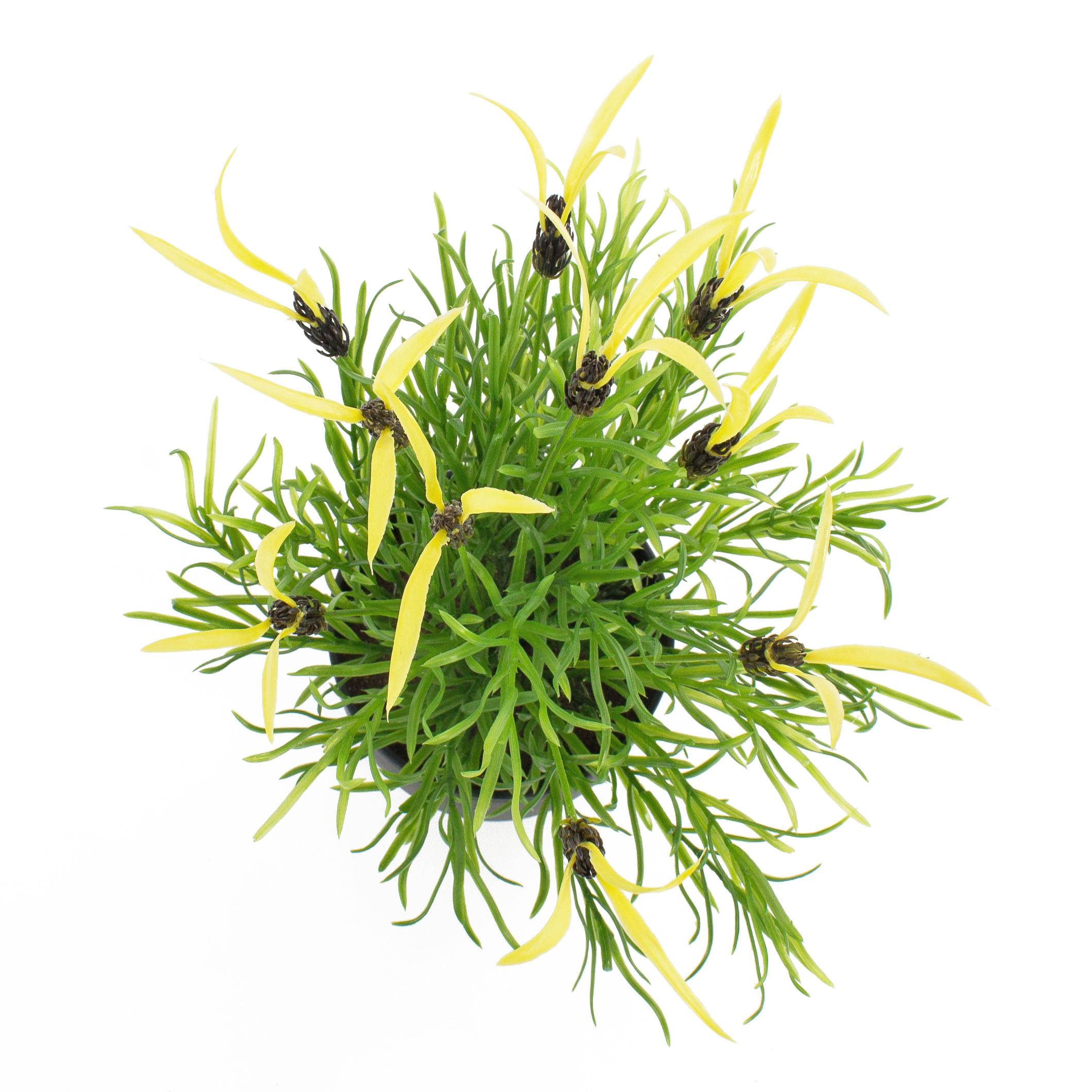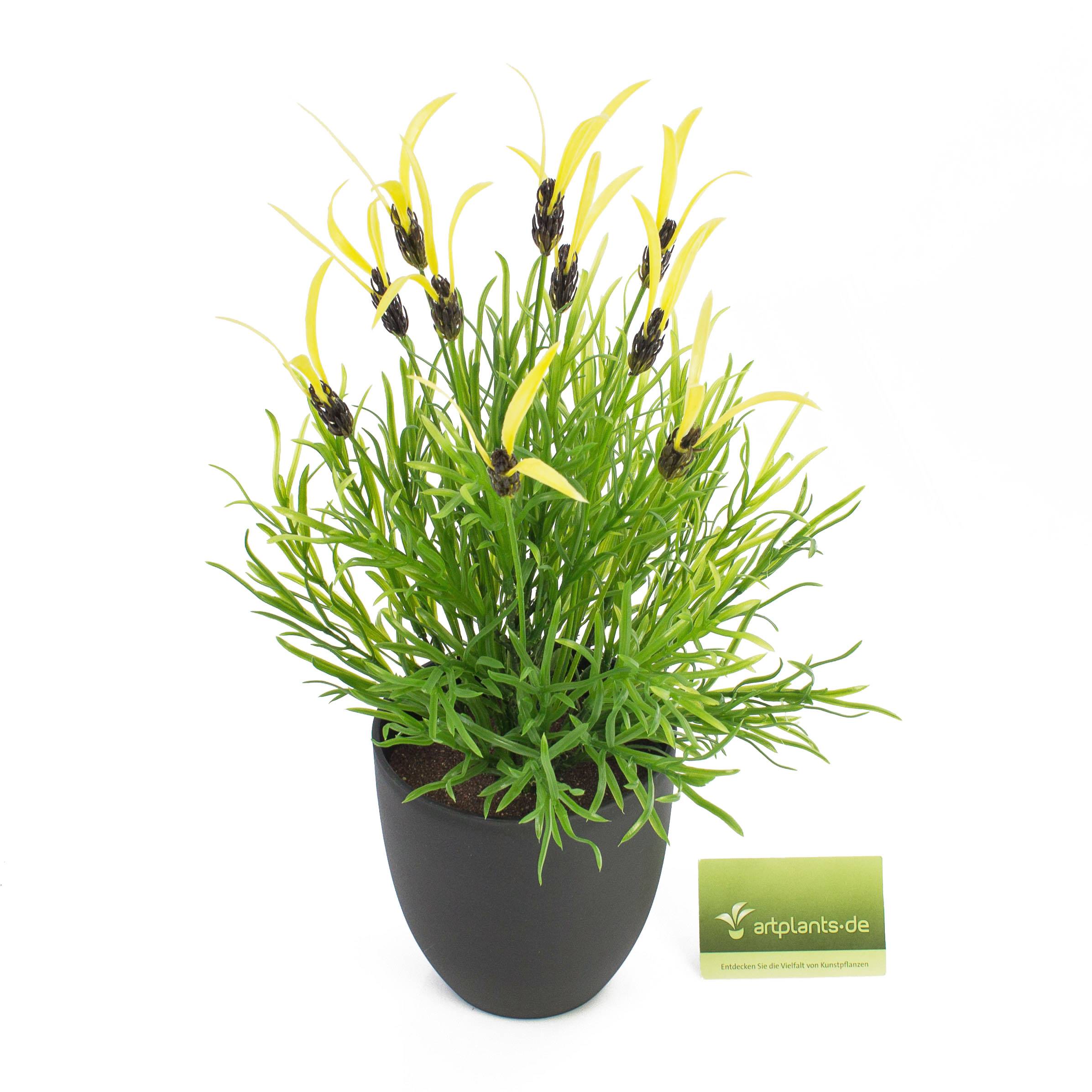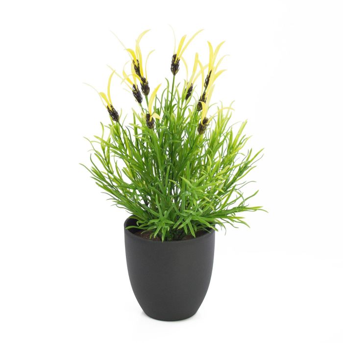 Lavanda selvatica (o Stecade) artificiale in grazioso vaso decorativo. Questa piantina ornamentale misura ca. 40 cm in altezza ed ha piccoli petali gialli.