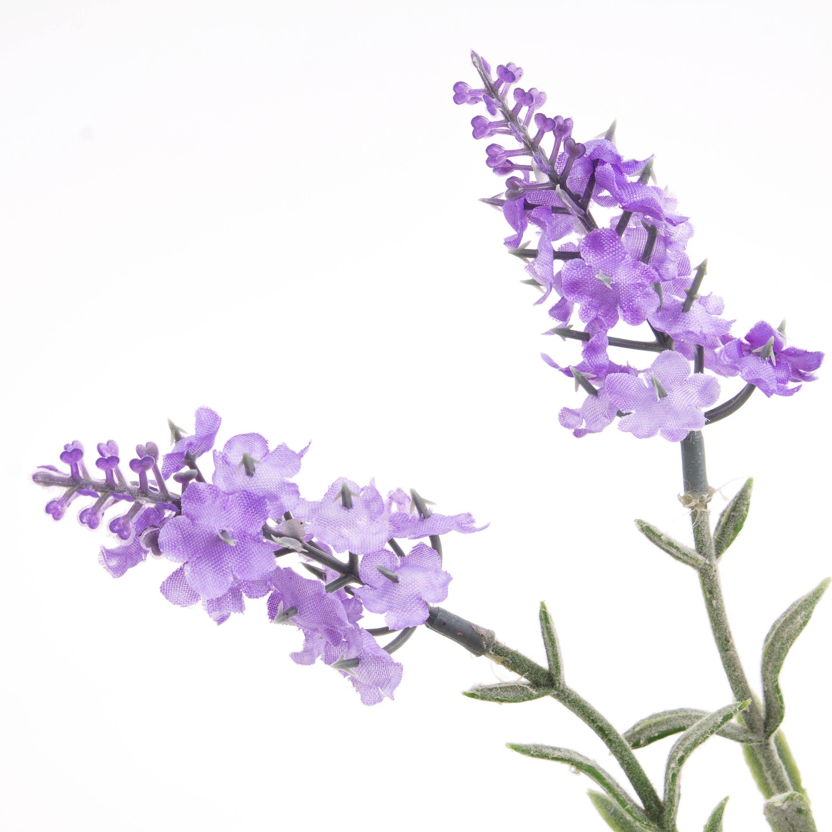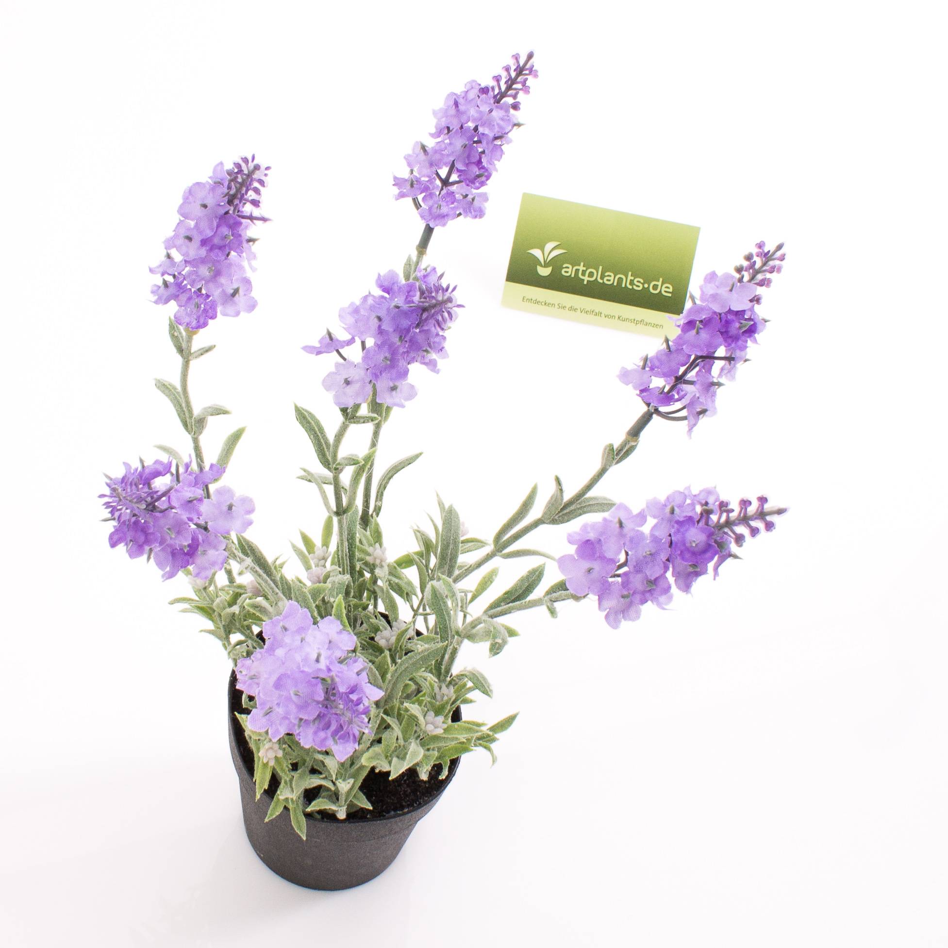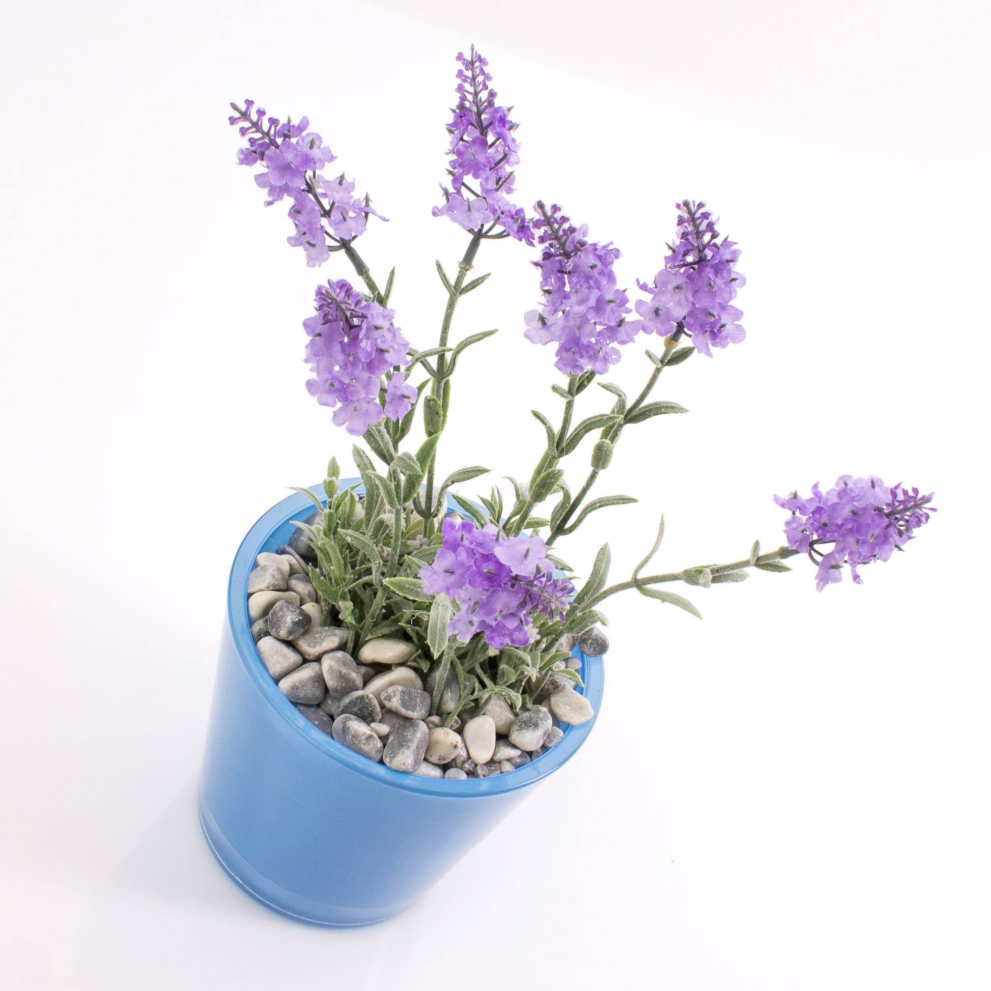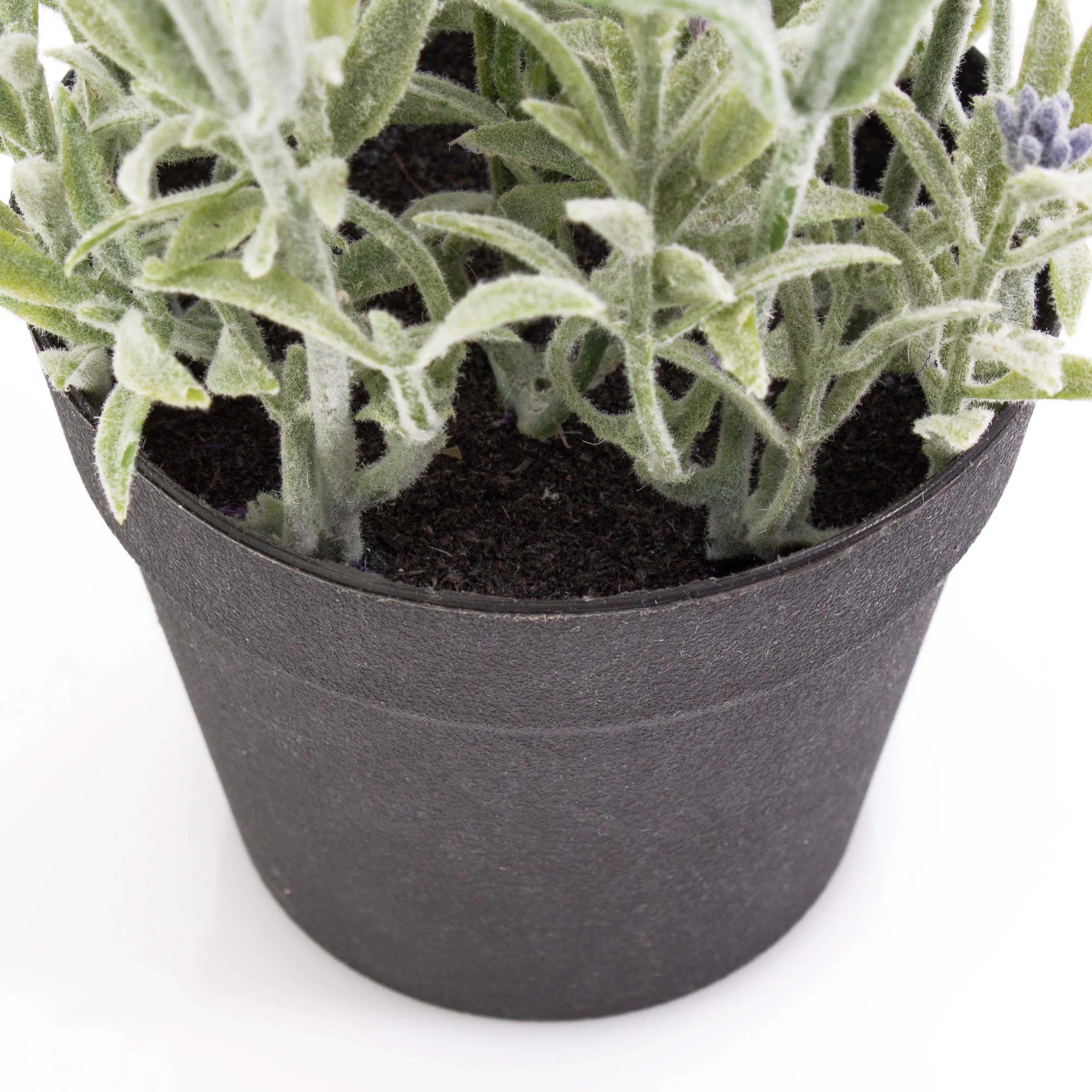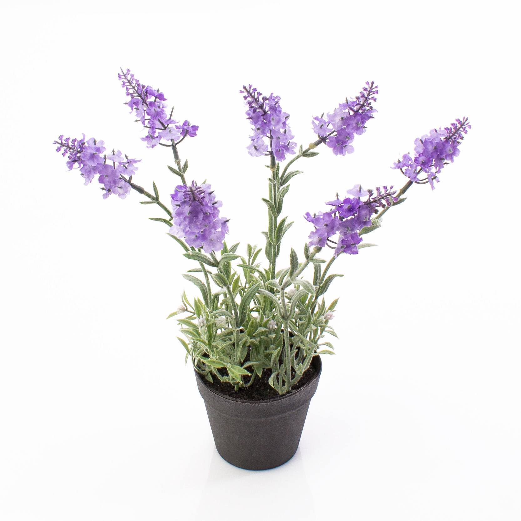 Pianta di lavanda decorativa in vaso nero di materiale artificiale con terra decorativa nera. L’altezza complessiva della pianta è di ca. 29 cm.