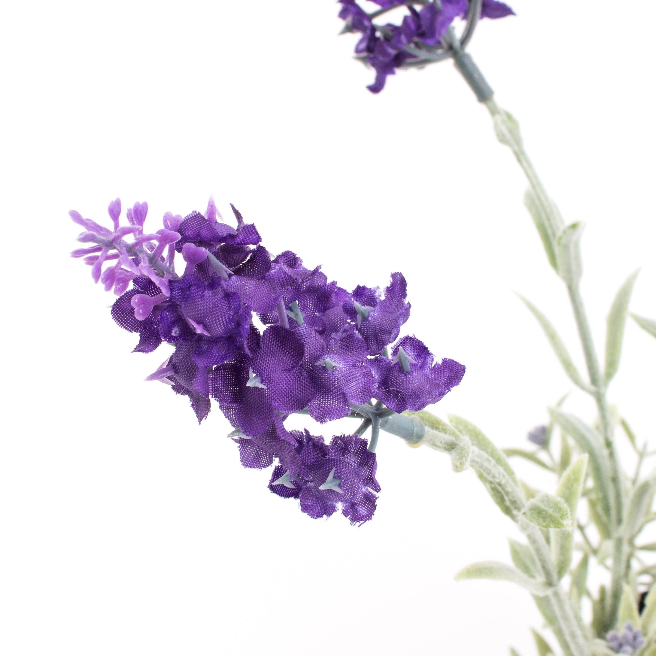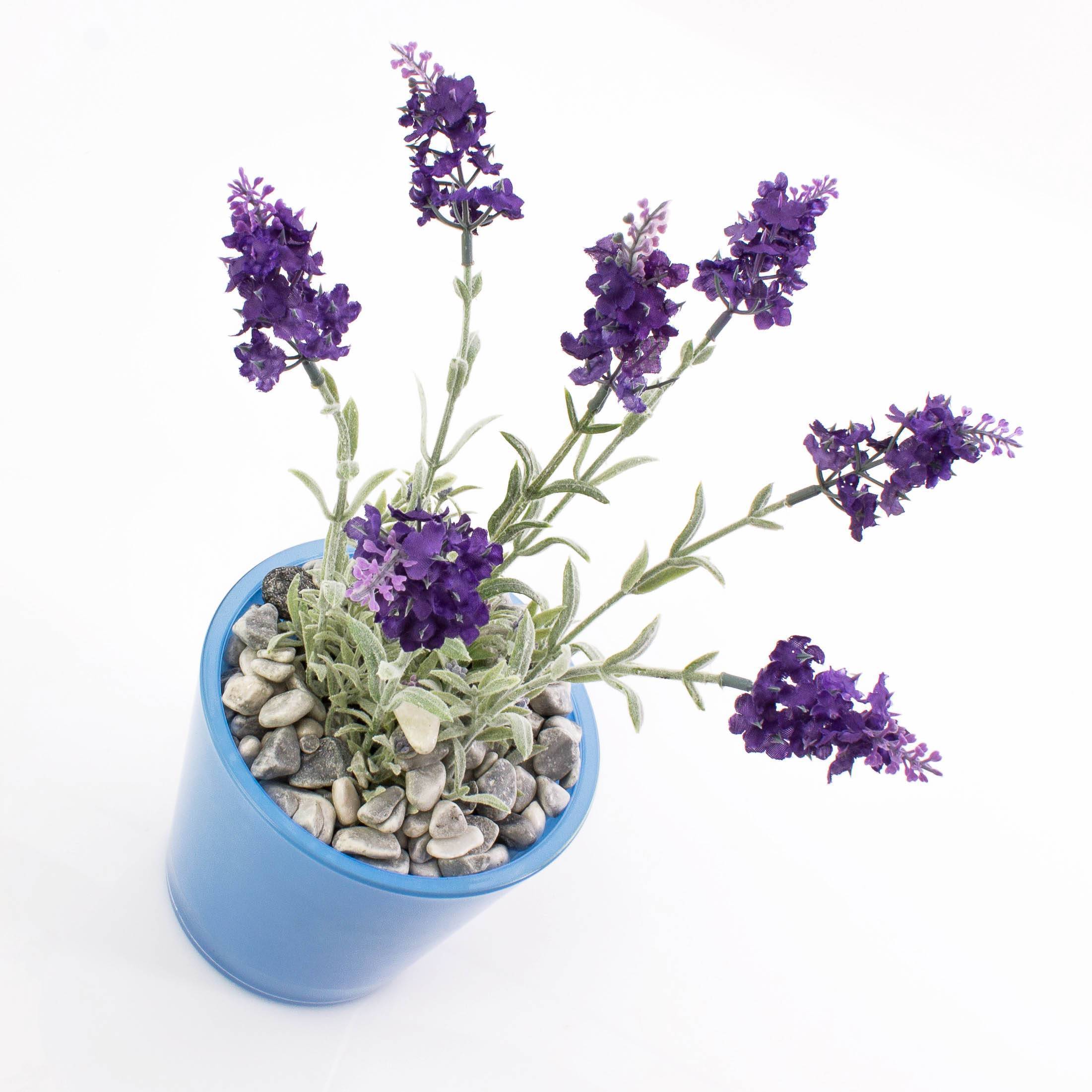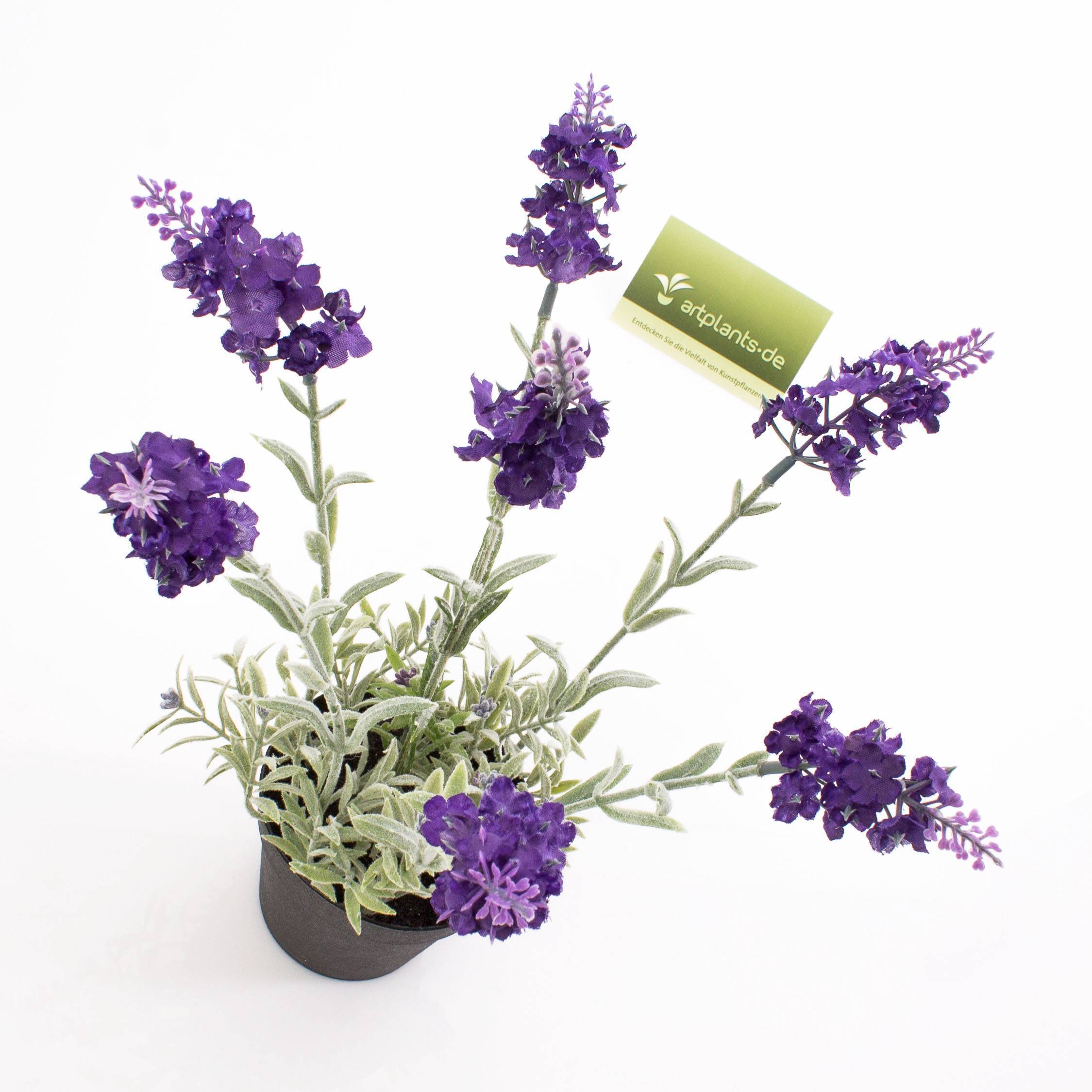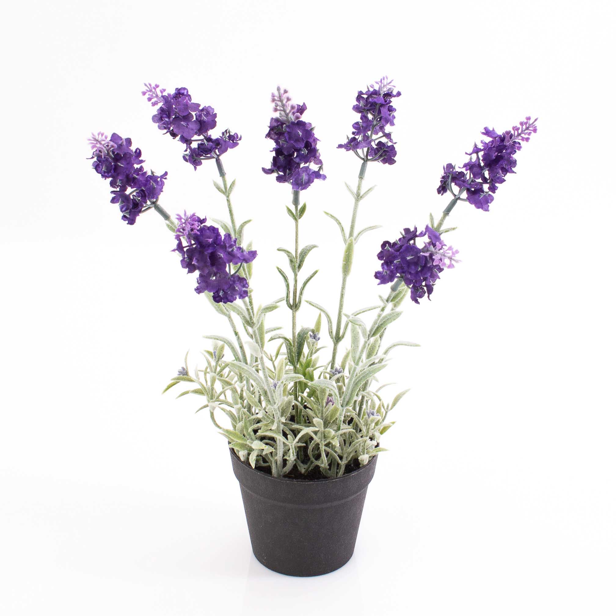 Pianta di lavanda decorativa in vaso nero di materiale artificiale con terra decorativa nera. L’altezza complessiva della pianta è di ca. 29 cm.