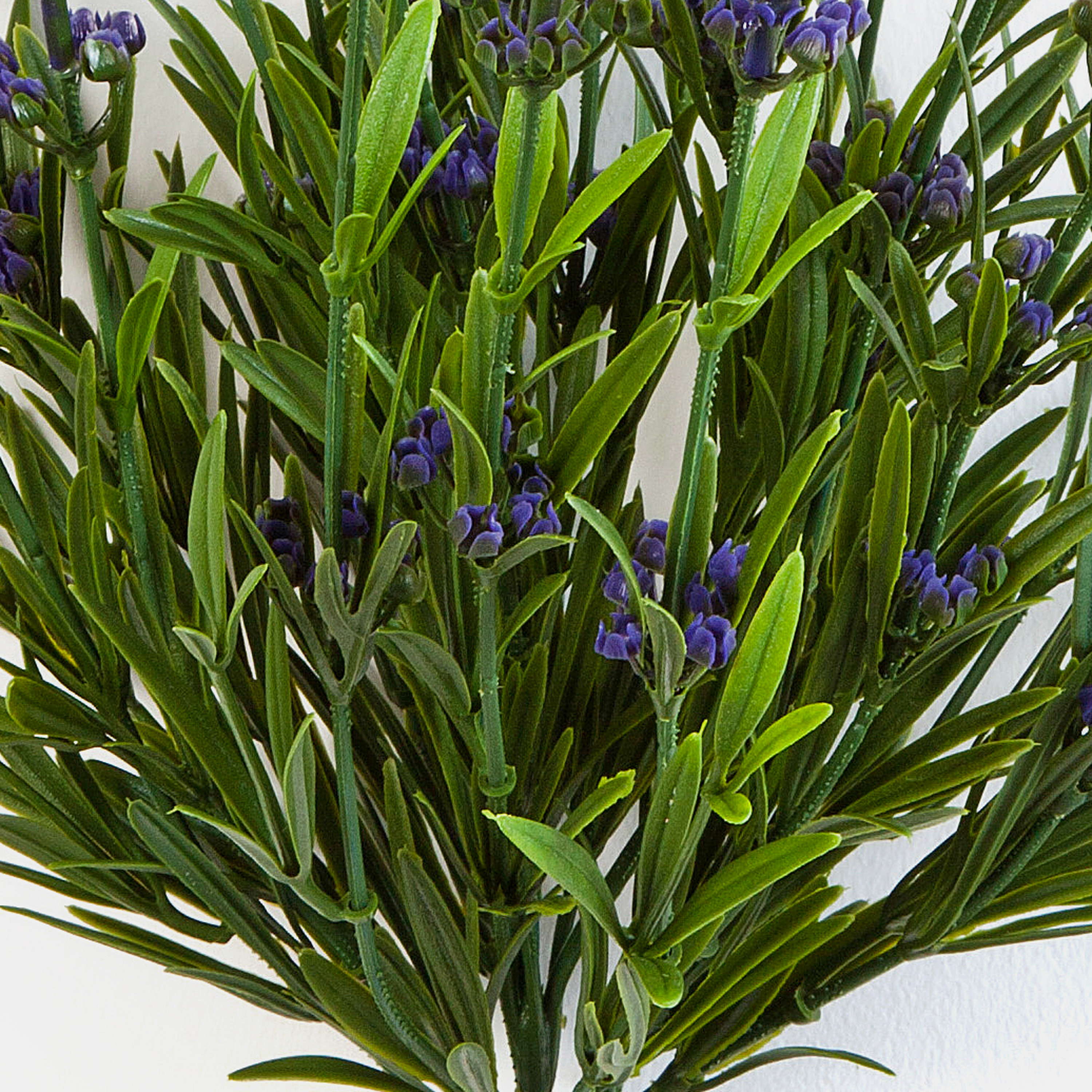 Il cespuglio decorativo di lavanda MARINA fissato su stelo, misura complessivamente ca. 50 cm di altezza. La pianta artificiale si compone di fiori lilla e foglie verde scuro di forma allungata.