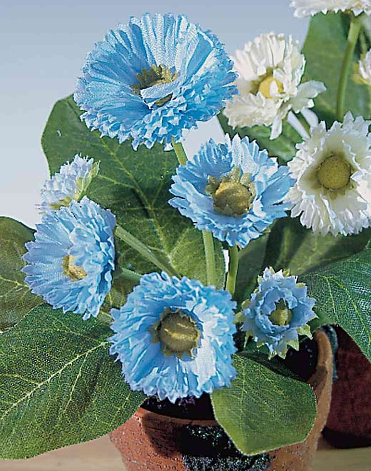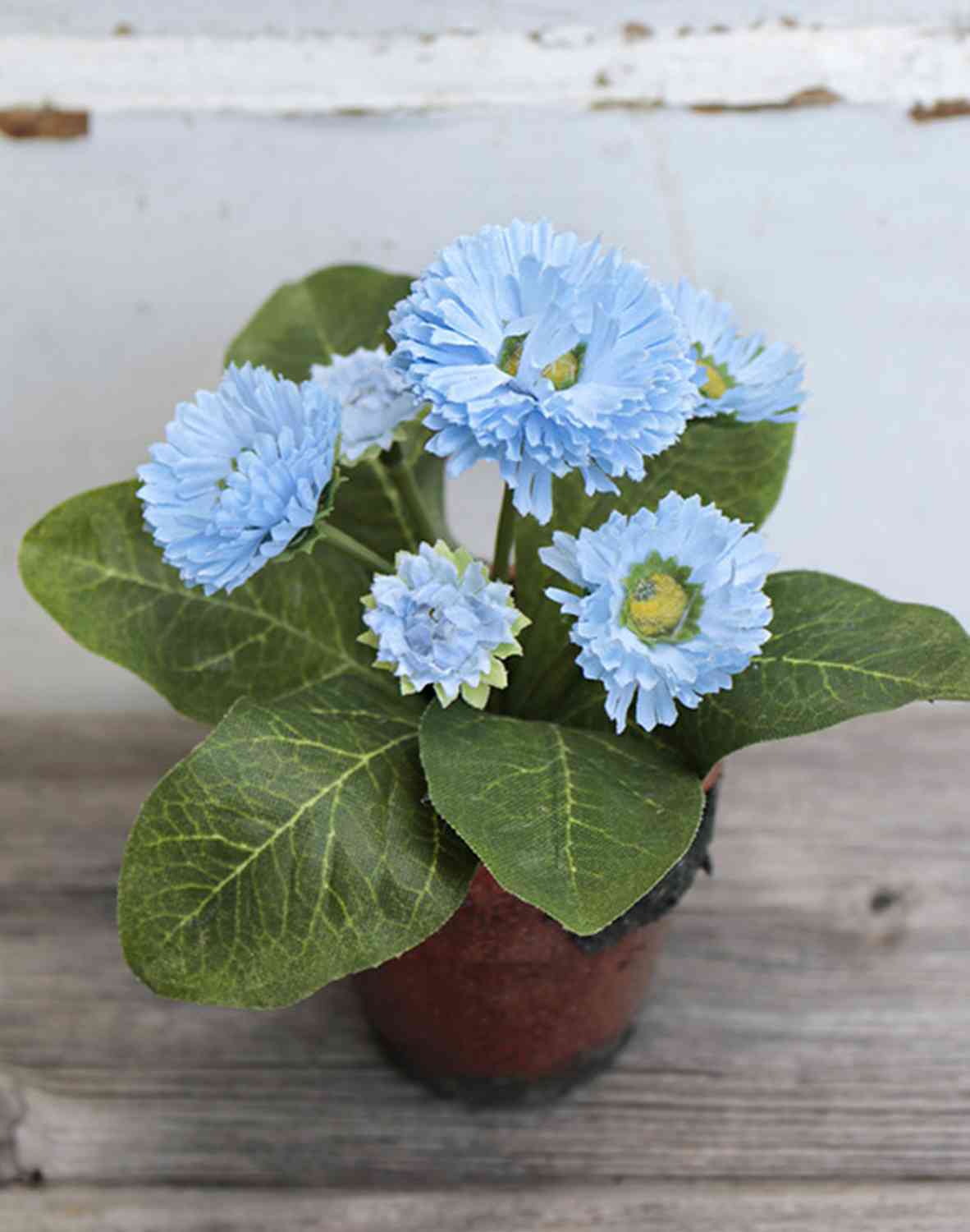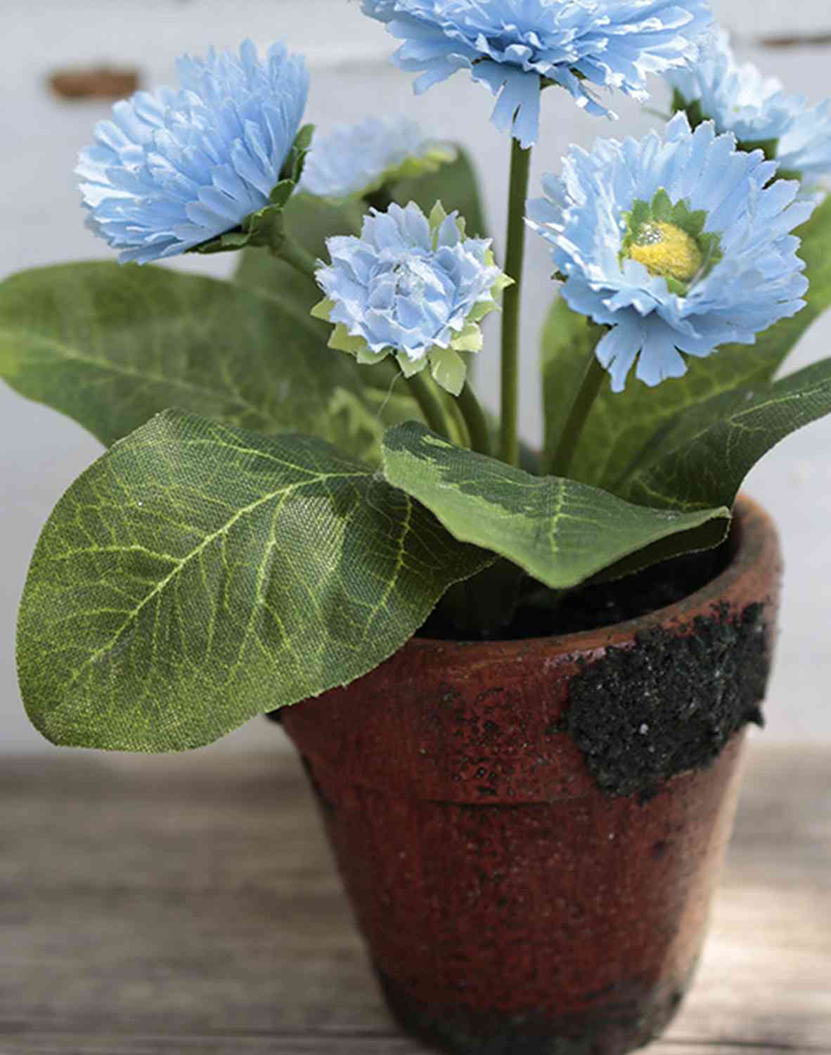 Margherite artificiali MORGANA, vaso di terracotta, blu chiaro, 15cm