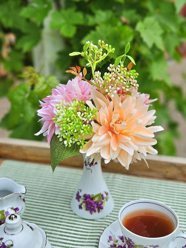 Mazzo di fiori artificiali Dahlias SAHNY con viburno, rosa-albicocca, 27 cm