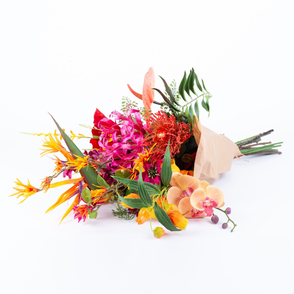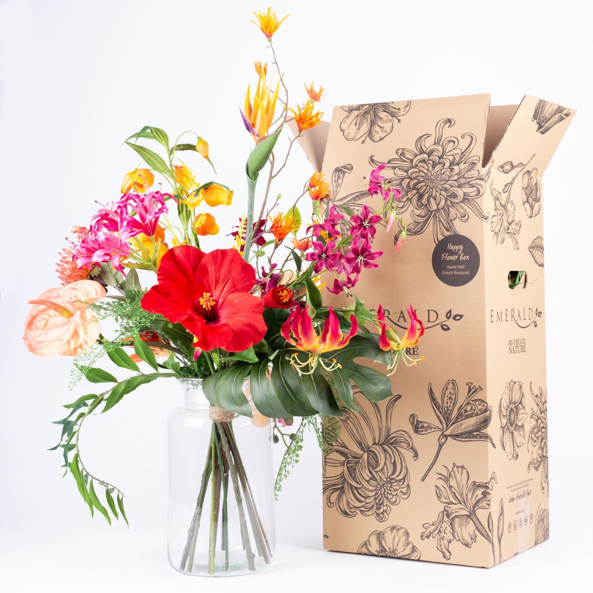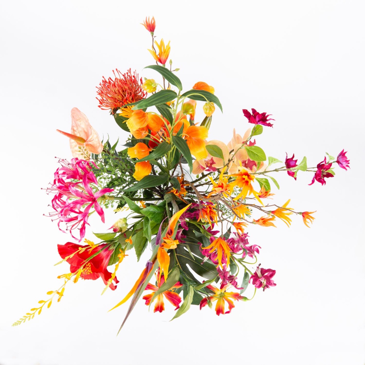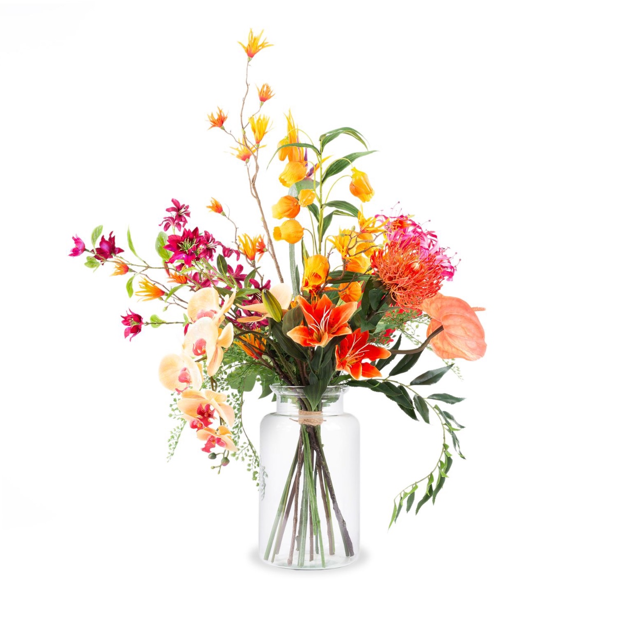 Caldo ed esotico. È così che spesso si presenta l'estate. La straordinaria strelitzia spicca nel bouquet come un uccello del paradiso ed è accompagnata da fiori tipicamente esotici come un fiore di ibisco rosso brillante, un fiore di agapanto rosa e un ramo di orchidea arancione.