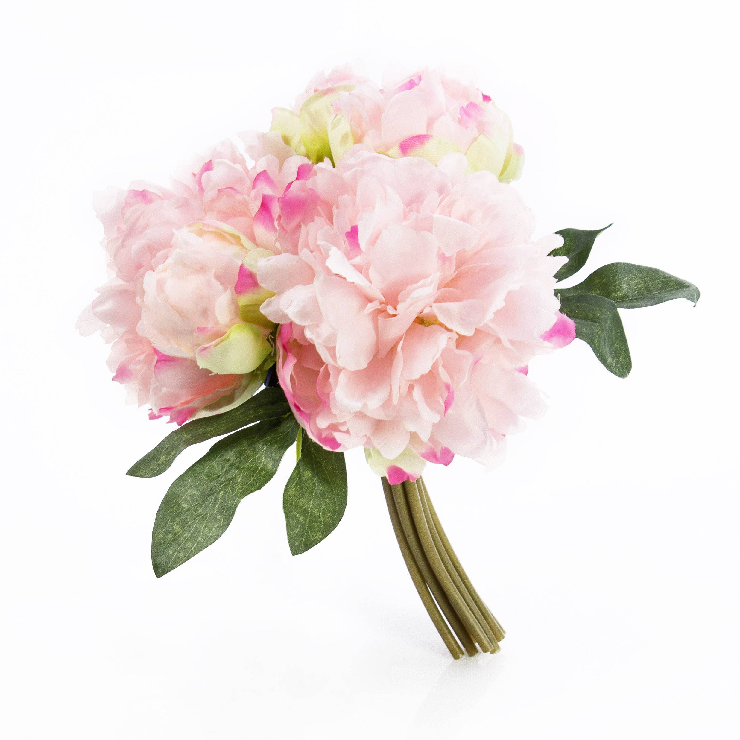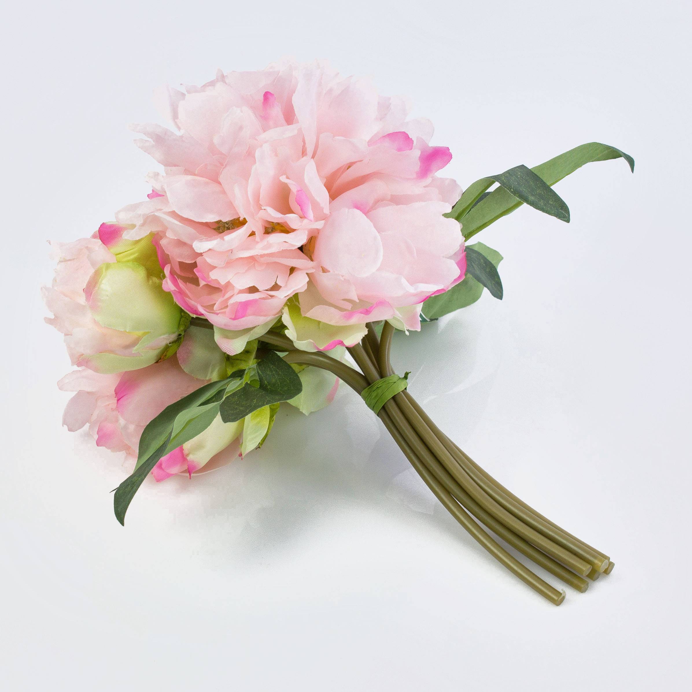 - 5 fiori singoli legati insieme da uno spago di rafia verde, colore dei fiori: rosa, con alcune sfumature fucsia (effetto acquerello). Mazzo composto da 3 peonie semichiuse con diametro di ca. 6 cm e altezza di ca. 7 cm e 2 aperte con diametro ca. 11 cm e altezza ca. 9 cm