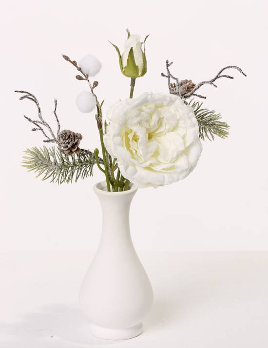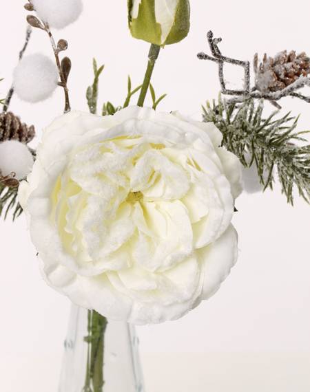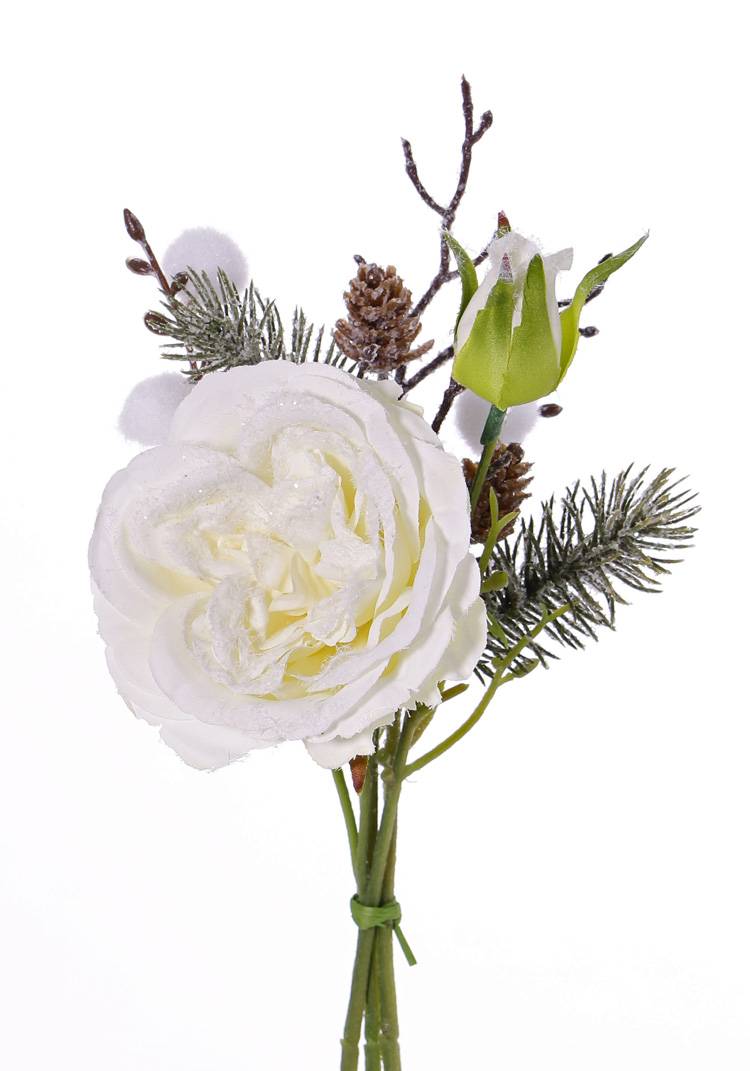 Mazzo di rose sintetico FANNI pigne, innevato, bianco, 30cm, Ø15cm