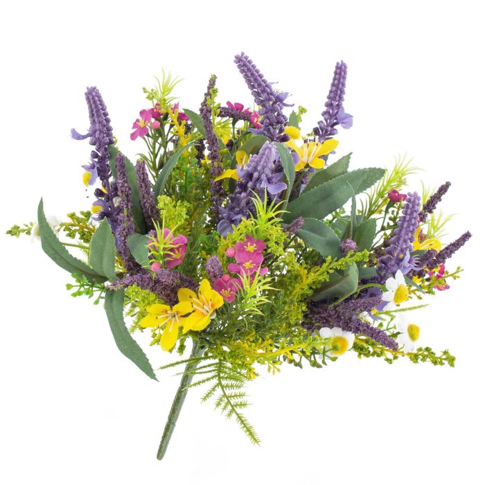 - Mazzo composto di: fiori di lavanda, ranuncoli, margherite, non ti scordar di me, gipsofila paniculata, foglie di lavanda e felce nei colori: giallo, viola, rosa, bianco