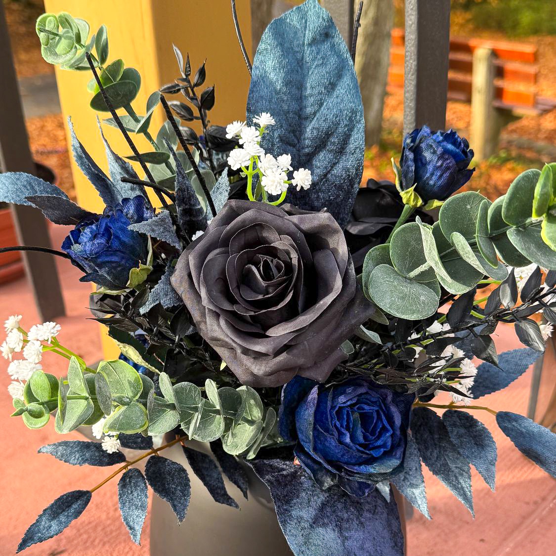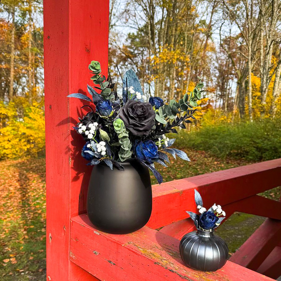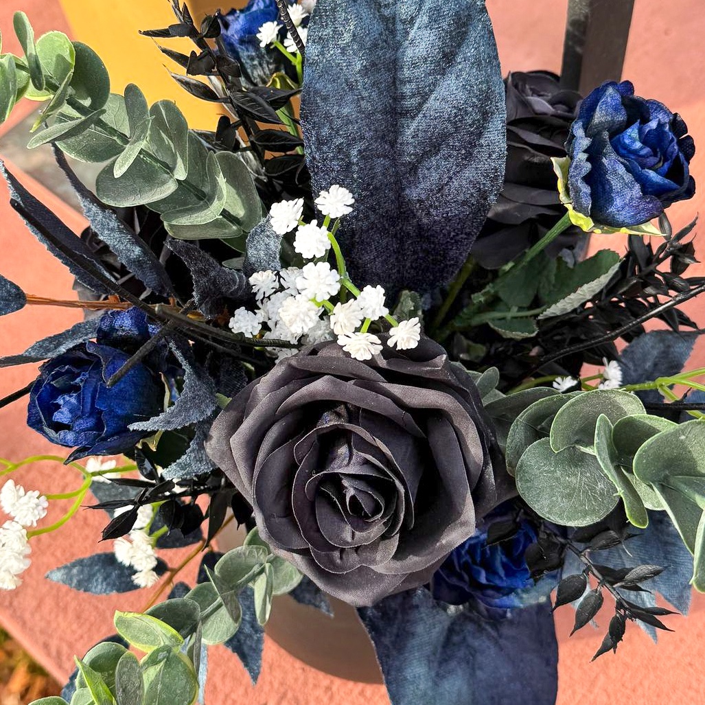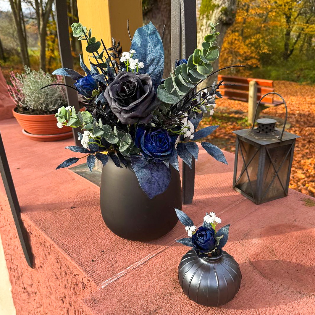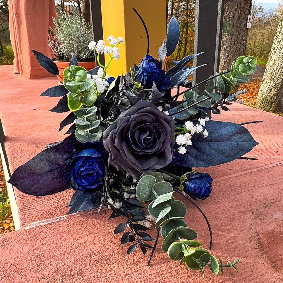 Quando l'arte floreale incontra l'eleganza senza tempo! Abbiamo avuto l'onore di occuparci dell'allestimento floreale completo per un matrimonio da sogno nel sud della Francia, su un'idilliaca penisola. La cerimonia si è svolta a metà novembre, un periodo in cui l'eleganza e la profondità dei colori risaltano in modo particolarmente efficace. La cliente desiderava un concept moderno e raffinato nei toni del nero e del blu scuro, completato da delicati accenti bianchi per un matrimonio dal gusto classico. Tutti gli elementi blu scuro hanno ricevuto una finitura vellutata che, soprattutto nella stagione più fredda, crea un effetto elegante e caldo. Il bouquet della sposa e la spilla abbinata per lo sposo costituiscono il cuore dell'intero concetto floreale, armoniosamente coordinati e stilisticamente determinanti per tutte le altre composizioni. Volete anche voi celebrare il vostro matrimonio con fiori artificiali? Acquistate il look!