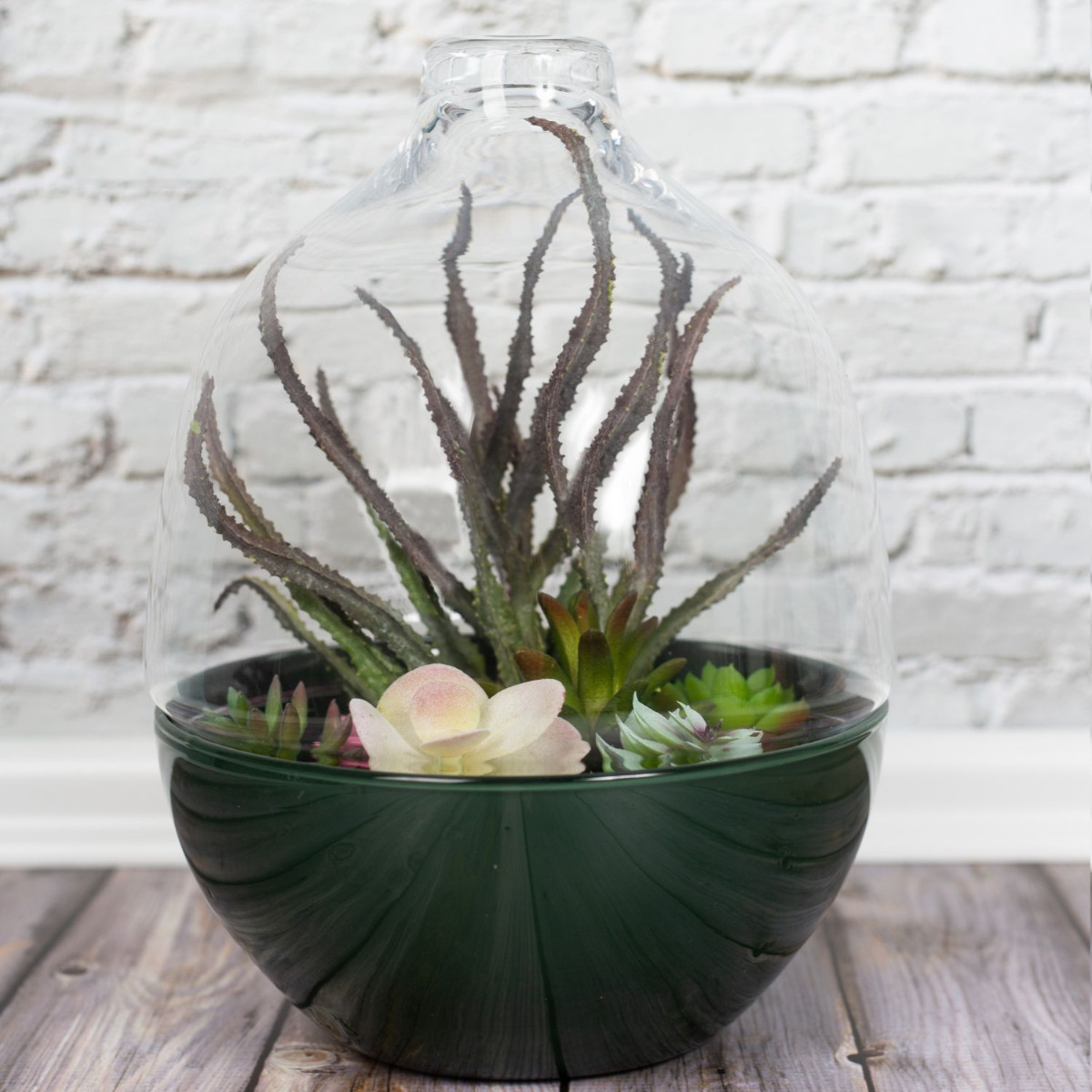Giardino tropicale in bottiglia! La varietà colorata di piante grasse di diverse forme rende il mini giardino davvero degno di nota. Piace a tutte le generazioni, sia ai bambini che agli uomini e alle donne. La bottiglia di vetro, che può essere divisa al centro, crea un proprio piccolo mondo che può essere ammirato dall'esterno. L'euforbia riempie in modo ottimale il vetro superiore e lascia spazio alle piccole piante grasse nella zona inferiore. Volete anche voi dare un nuovo tocco di luce al vostro spazio abitativo? Acquistate il look!