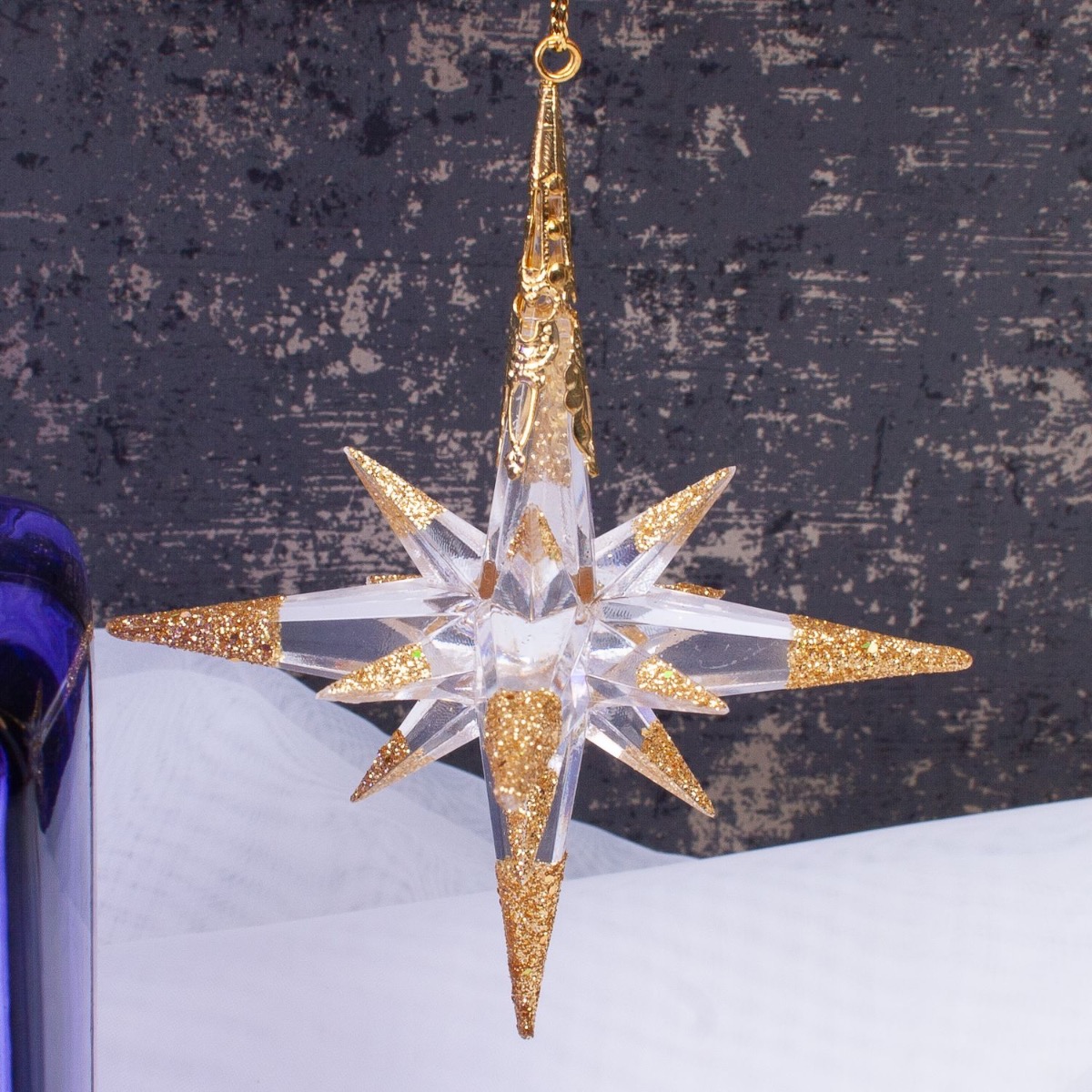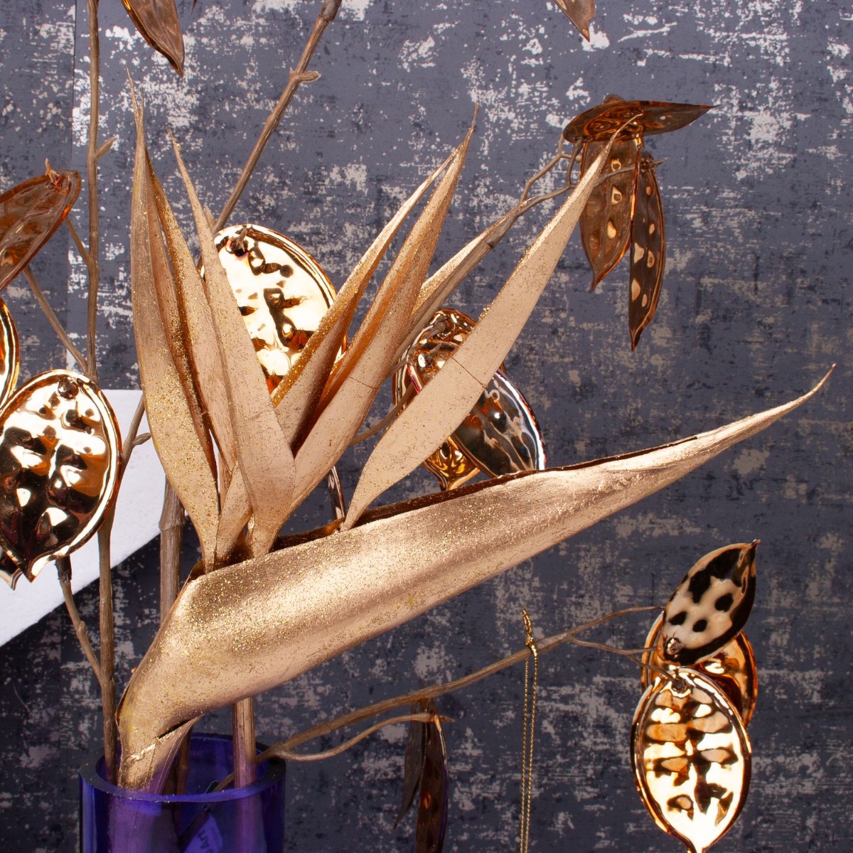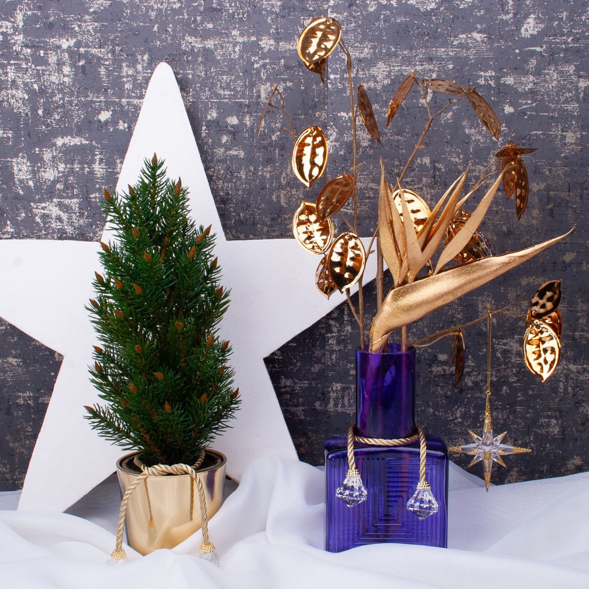 Viola e dorato! Una combinazione di colori dall'aspetto elegante. Il vaso viola della serie ORESTINO è stato decorato con piante artificiali dorate in questo look. Anche le piante tropicali, come la strelitzia dorata, hanno un aspetto davvero natalizio. I nostri baubles in acrilico con cordoncino dorato avvolgono il vaso come una sciarpa. Un delicato albero di Natale davanti a una stella di polistirolo completa perfettamente il look natalizio. Acquistate il look!