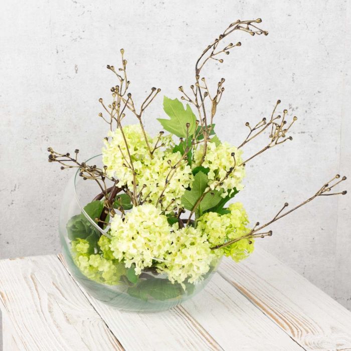 Verde lime e marrone dorato!Questi fiori di viburno leggermente verdastri, intervallati da boccioli marrone dorato, hanno un effetto meravigliosamente delicato. Una ciotola a sfera in vetro con apertura obliqua si adatta molto bene a questa disposizione perché i grandi fiori sottolineano la forma del bicchiere. Un look estivo che sta bene ovunque. Acquista il look!