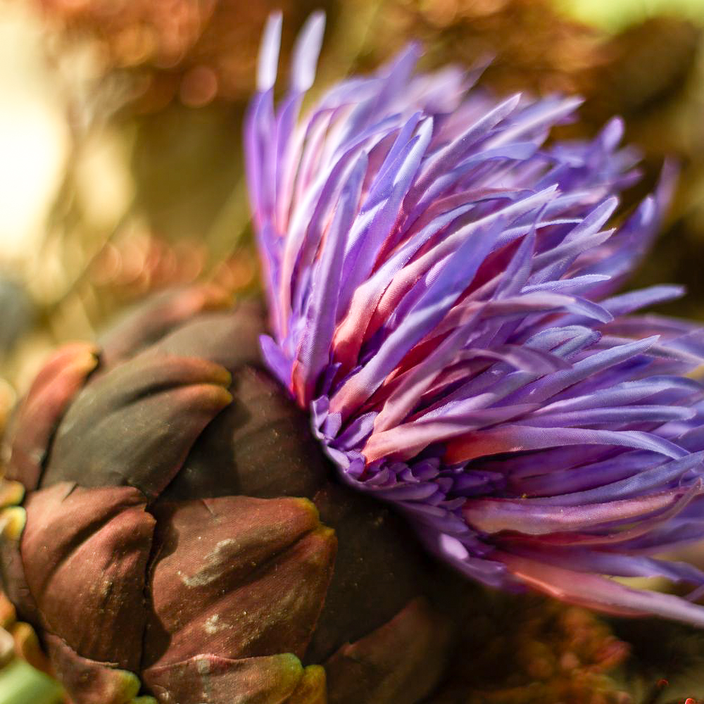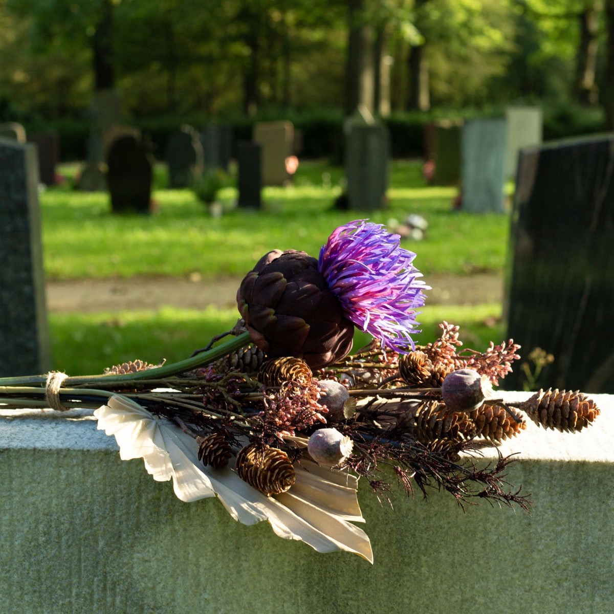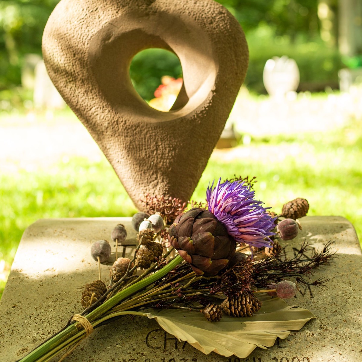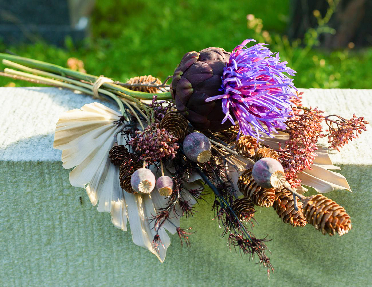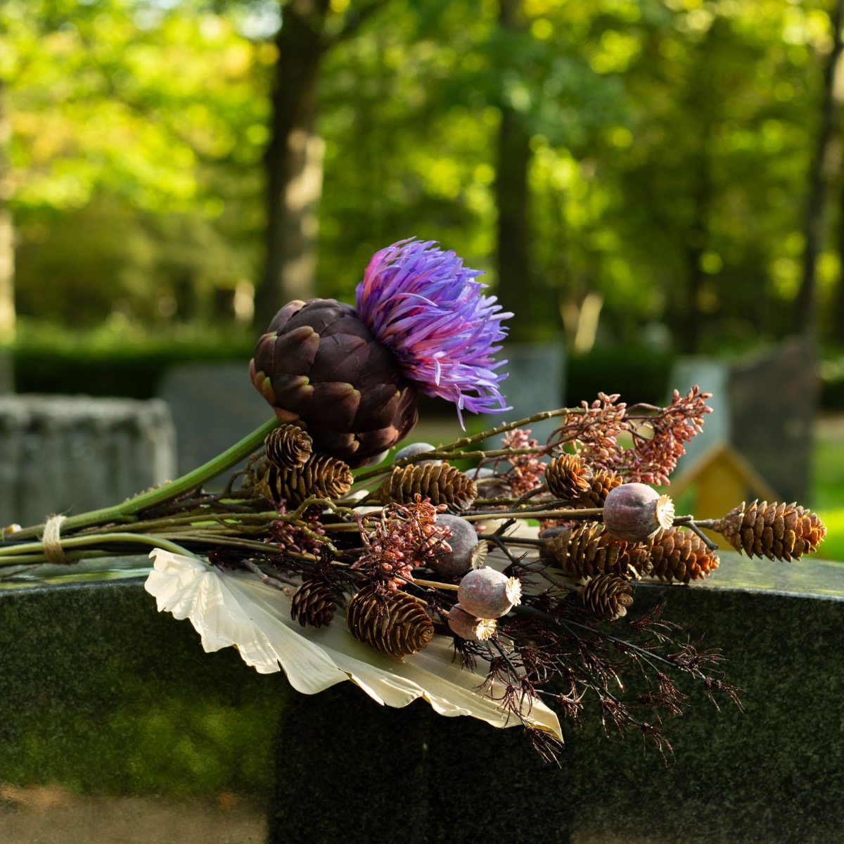 I colori del lutto! Quando si perde una persona cara, la vita cambia in modo significativo. Ciò che rimane è il ricordo. Nel giorno di Ognissanti, commemoriamo i defunti e ricordiamo vite meravigliose. Le tombe vengono curate e decorate con nuovi fiori. È molto pratico se i fiori non appassiscono e abbelliscono la tomba in modo permanente. Nessun appassimento, nessuna annaffiatura e un effetto davvero naturale. Il misterioso colore viola del fiore del carciofo brilla nell'oscurità del cimitero ed è allo stesso tempo moderno contro le foglie di palma color terra. Acquistate il look!