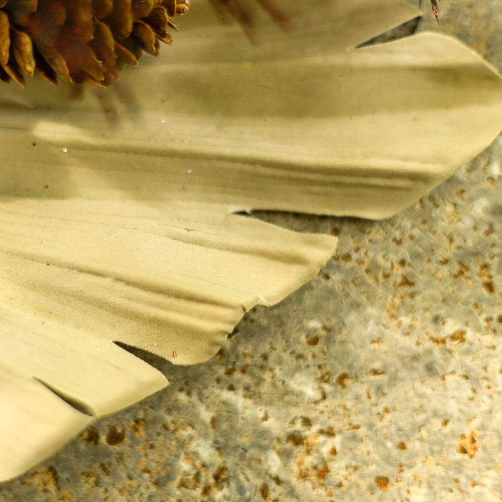 Consiglio per la decorazione: Posizionare il fiore principale (fiore di carciofo) in primo piano e la foglia di palma sullo sfondo. Gli accessori sono posizionati in mezzo e devono incorniciare discretamente il fiore di carciofo.