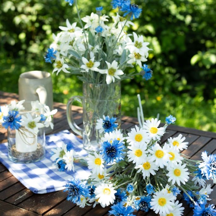 Germania. E, naturalmente, è particolarmente importante avere pronte le giuste decorazioni. Lo stile "Wiesn" ne fa semplicemente parte. Margherite e fiordalisi sono il nostro emblema blu e bianco. La tradizione prevede un bouquet per la signora e un piccolo bouquet all'occhiello per il signore. Il bouquet di stelle alpine e fiordalisi è disponibile solo presso Artplants, poiché la stella alpina è una specie protetta. La stella alpina simboleggia il coraggio, l'audacia e l'amore. Se questo non è un messaggio nascosto per la persona amata... Acquistate il look!