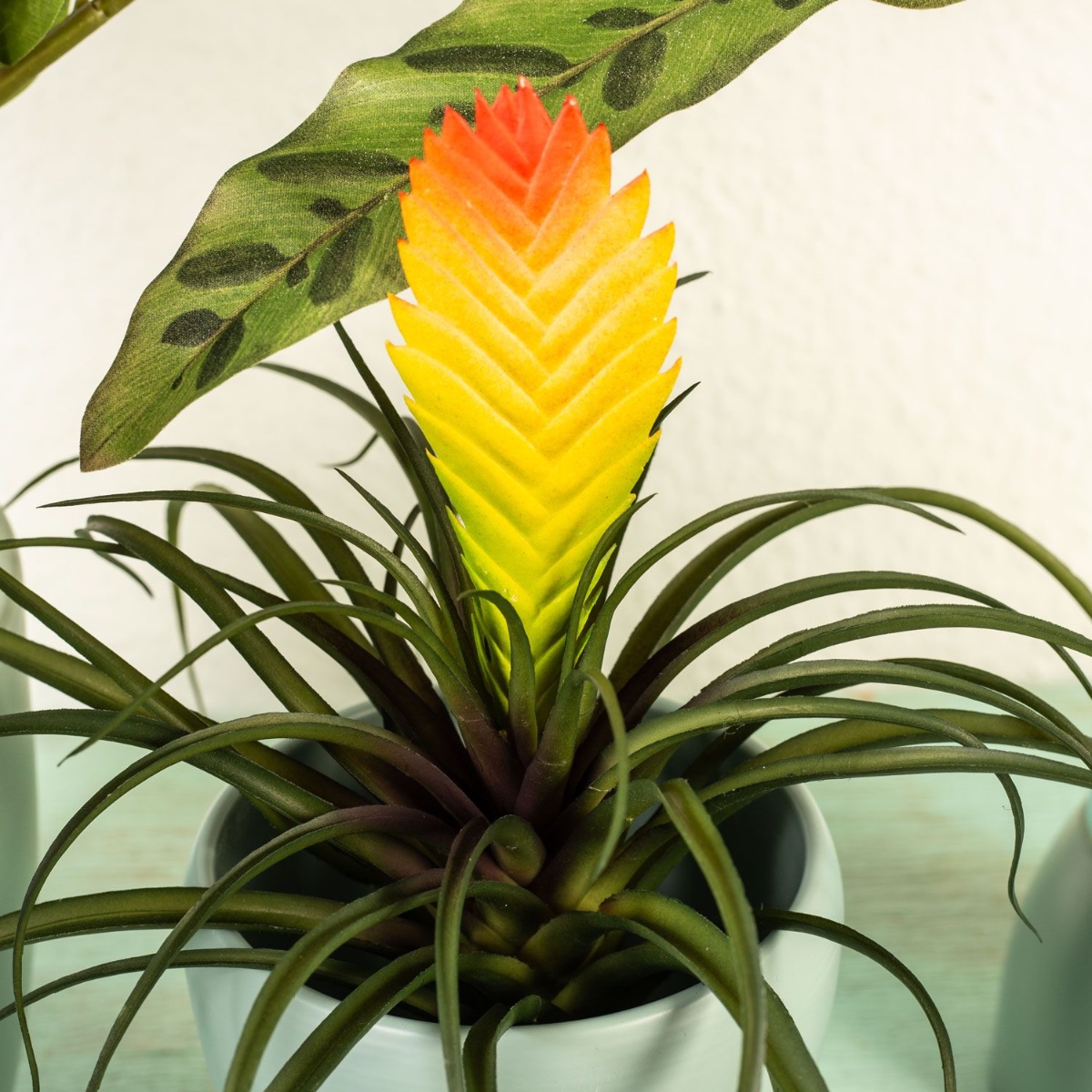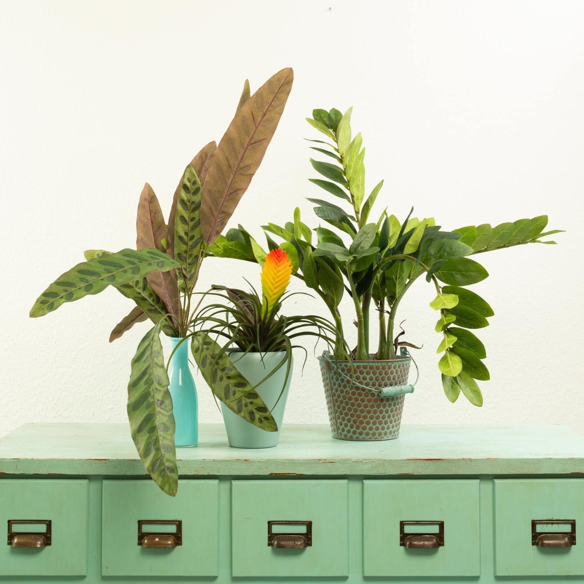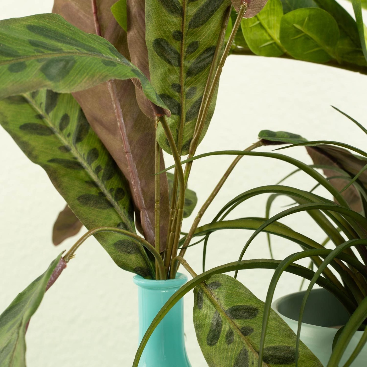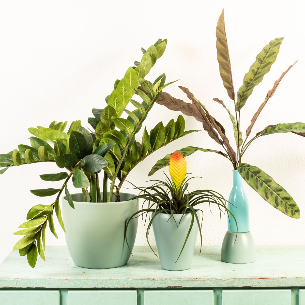 Design suggerimento: Metti semplicemente la piuma portafortuna nel vaso e il bastoncino di Calathea nella bottiglia, quindi metti il bastoncino di Vriesea nel vaso alto per orchidee e riempilo con granuli di sughero. Piega tutte le piante alla dimensione appropriata.