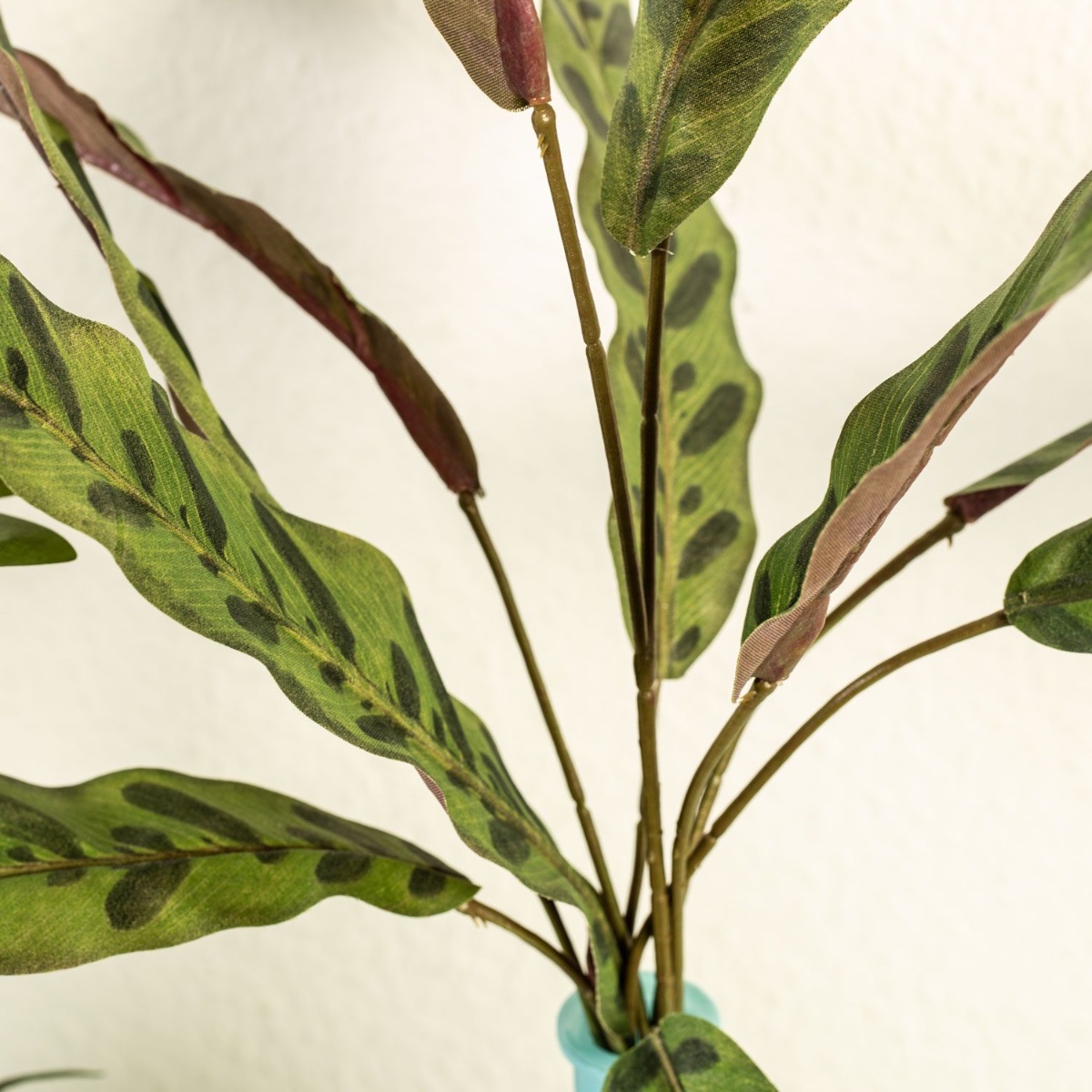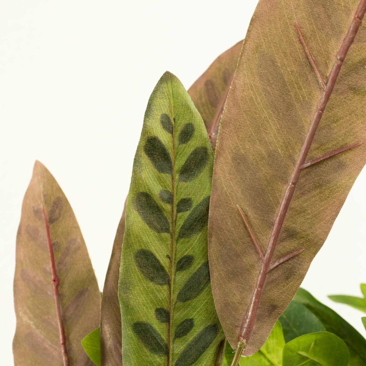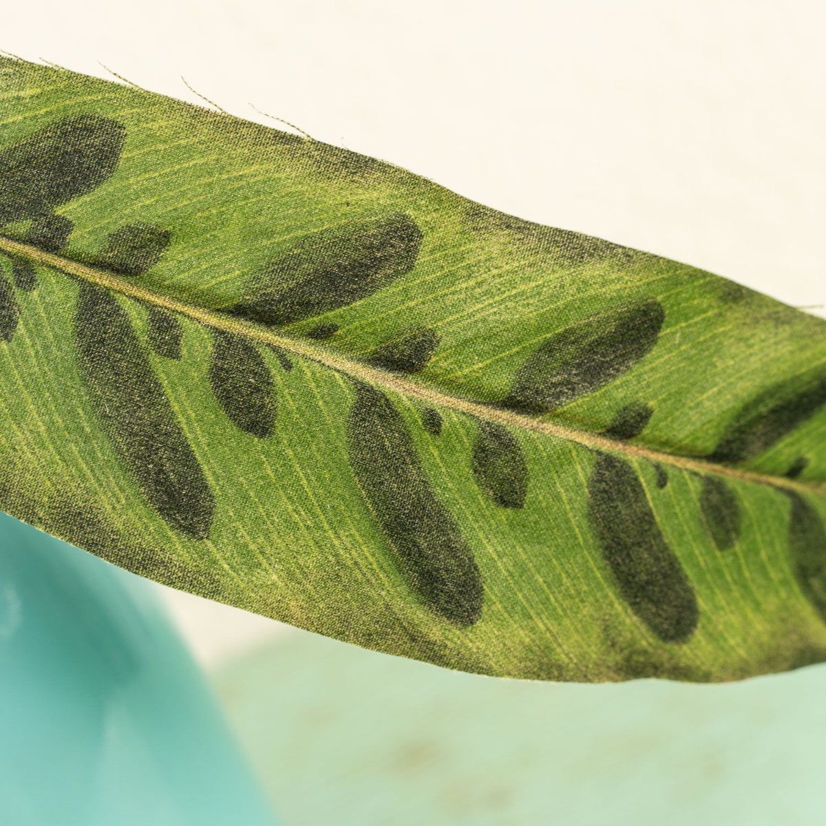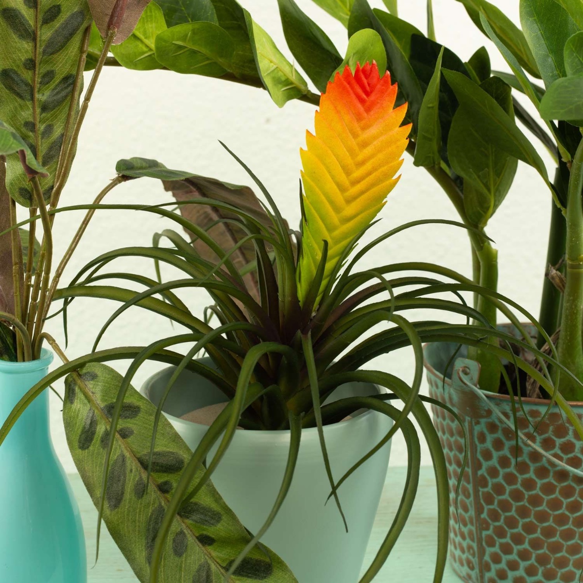 Design suggerimento: Metti semplicemente la piuma portafortuna nel vaso e il bastoncino di Calathea nella bottiglia, quindi metti il bastoncino di Vriesea nel vaso alto per orchidee e riempilo con granuli di sughero. Piega tutte le piante alla dimensione appropriata.