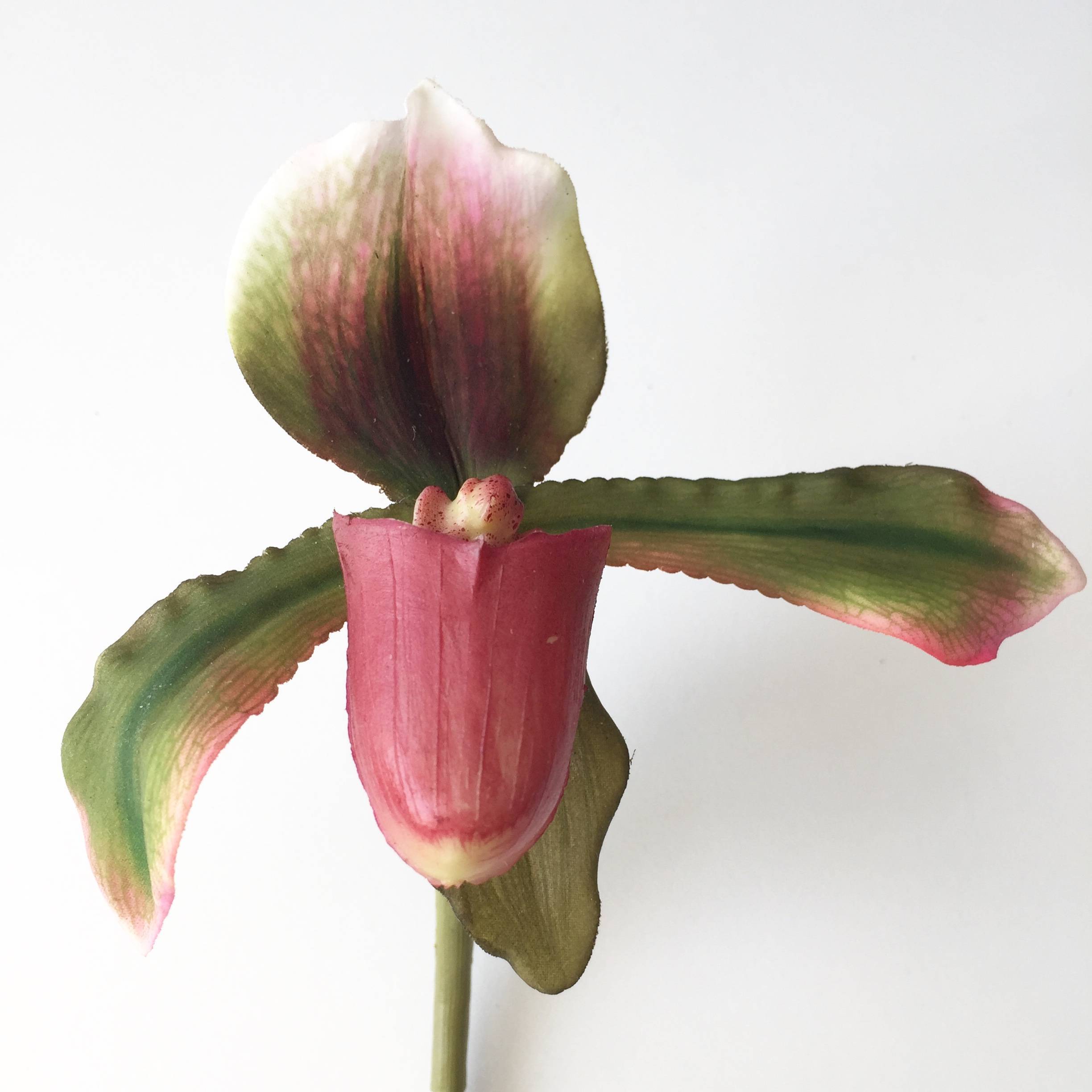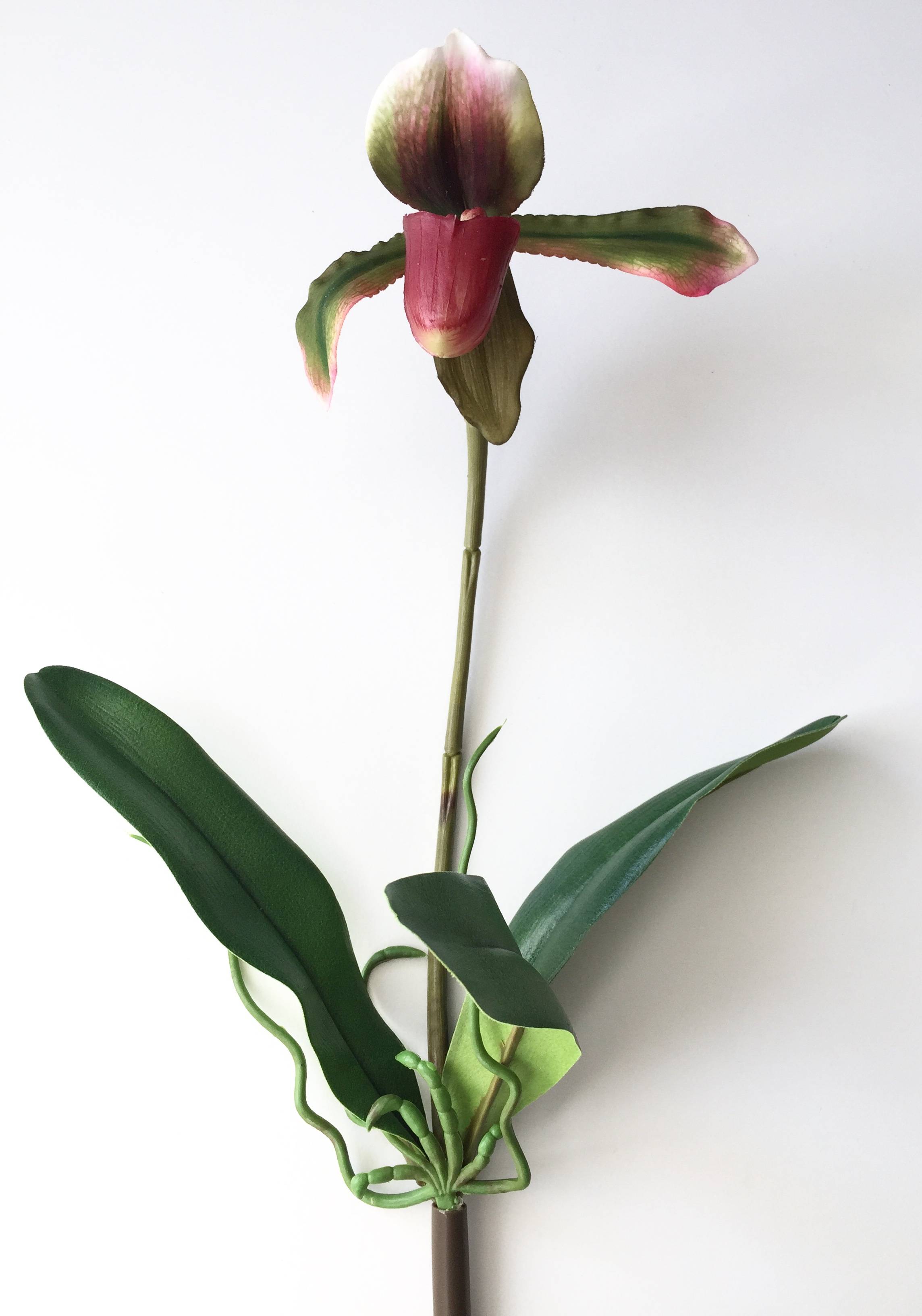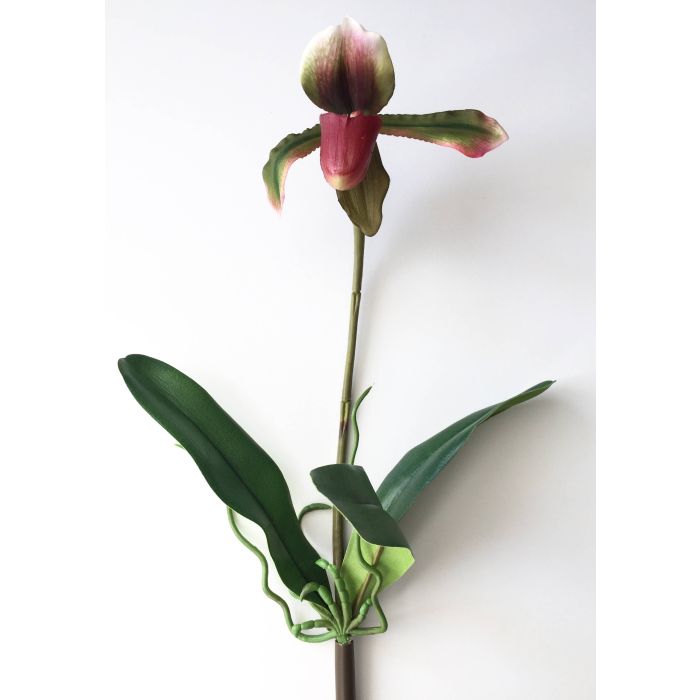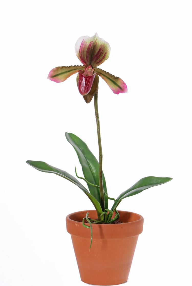 L'orchidea decorativa paphiopedilum VELANA è ideale con il suo fiore colorato e fedele realizzato in materiale realtouch (tocco reale).