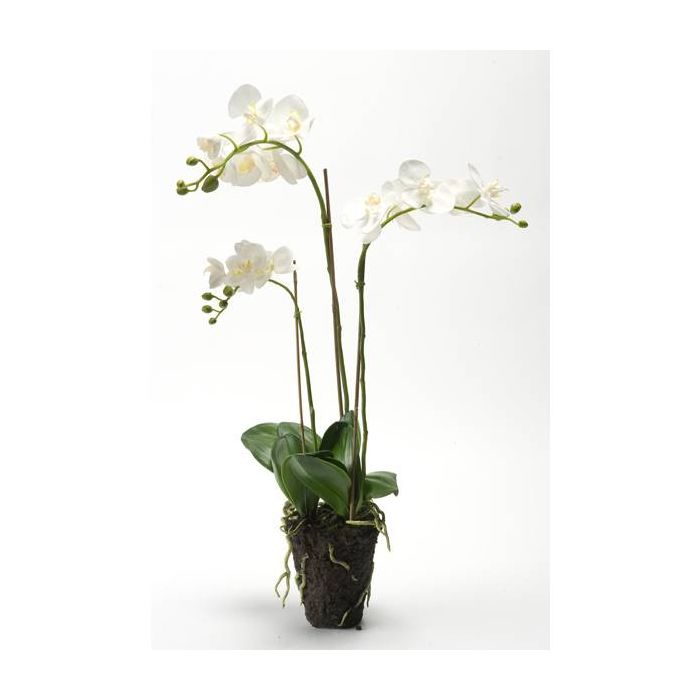 Orchidea Phalaenopsis PABLA artificiale, con 3 steli che si dipartono da una boccia di terra, con radici visibili e infiorescenze color bianco-giallo. L´orchidea decorativa misura un´altezza da capo a capo di ca. 70cm.