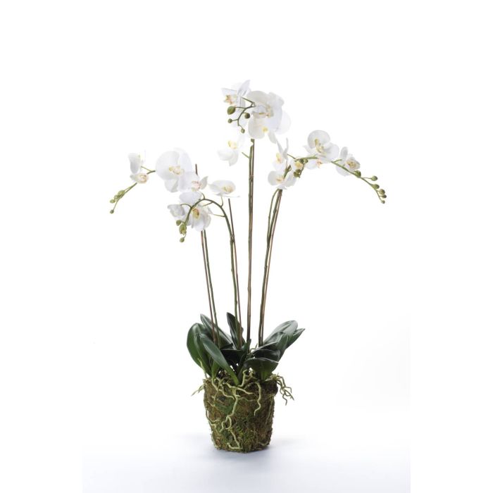 Orchidea Phalaenopsis PABLA artificiale, con 4 steli che si dipartono da una boccia di terra, con radici visibili e infiorescenze color bianco-giallo. L´orchidea decorativa misura un´altezza da capo a capo di ca. 90cm.