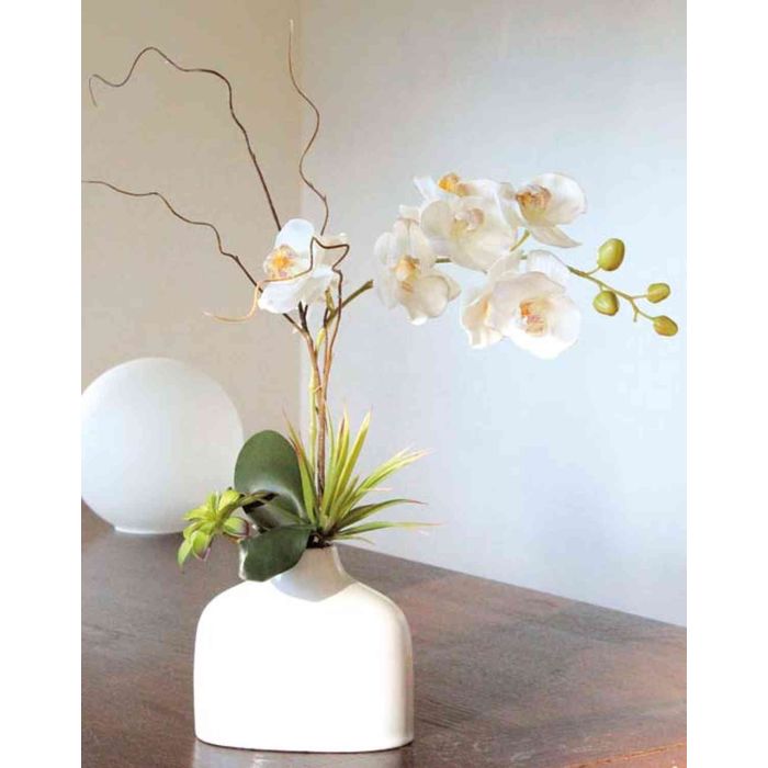- Fiore artificiale (tocco vero) in bianco, con echeveria e agave in verde-rosso e rami a cavatappi