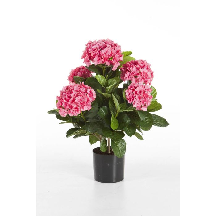 Ortensia artificiale color rosa - fuxia con 230 fiori e 135 foglie verdi. La pianta viene consegnata in base cementata ed ha un´altezza complessiva i circa 55 cm.