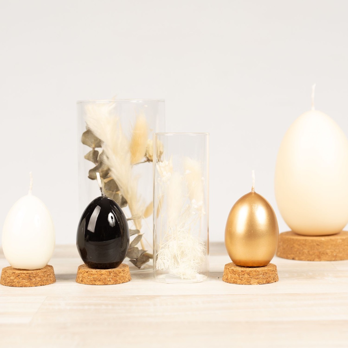 Dorato e nero! Con questi colori non si pensa subito alla Pasqua e alla primavera. Ma quando si osserva questo look di classe, viene davvero voglia di andare alla caccia alle uova annuale. Candele a forma di uovo di Pasqua di diverse dimensioni, con un design nobile e una laccatura dorata o nera incredibilmente lucida. In abbinamento, abbiamo selezionato due prodotti della nostra gamma di fiori secchi. I vasi tubolari, riempiti di fiori secchi, sono assolutamente moderni al momento e sottolineano l'aspetto nobile delle candele a uovo. Buona Pasqua! Acquista il look!