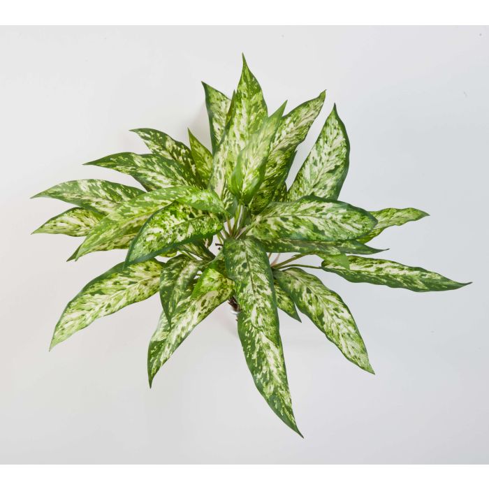 Pianta di Aglaonema artificiale ASMARA a cespuglio con foglie dalla tipica fantasia verde-bianca e dall'aspetto particolarmente veritiero e naturale. Questa pianta decorativa misura ca. 50 cm in altezza ed è compresa di gambo che ne facilita e rende più immediata la messa in posa in un vaso a vostra scelta.